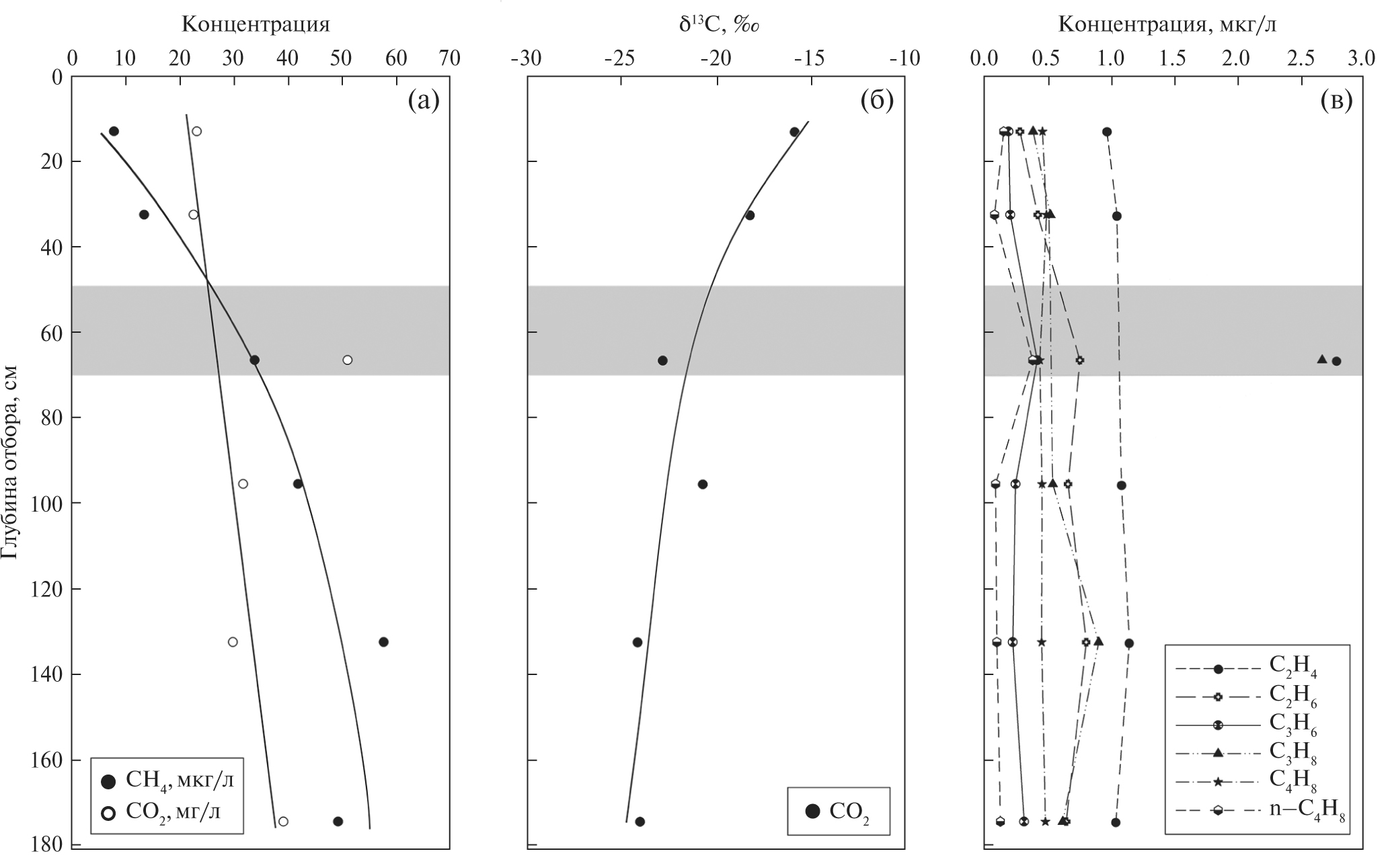 Рис. 6. Изменение концентрации СО2, СН4 (а), δ13С(СО2) (б) и концентрации углеводородных газов (в) в зависимости от глубины морского осадка, отобранного на станции 5602-2 (серым цветом показана зона сульфат-редукции).