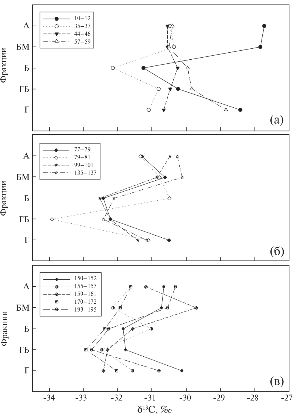 Рис. 7. Вид изотопно-фракционных характеристик ОВ на различных глубинах (а – интервал 10–59 см, б – 77–137 см, в – 150–195 см) осадка, отобранного на станции 5602-2.