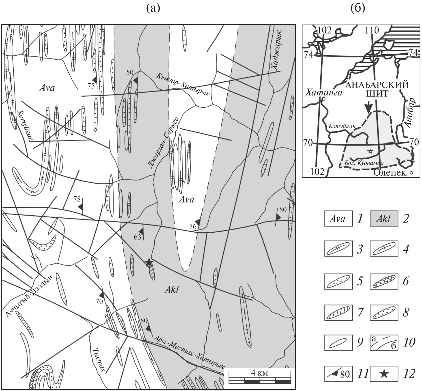 Рис. 1. (a) Геологическая схема истоков рек Котуйкан и Кюкюр-Хатырак, составленная с использованием (Геологическая карта…, 1975), и (б) положение Анабарского щита в Сибирском кратоне (звездочкой показаны область развития изученных сапфиринсодержащих гранулитов и место отбора проб). 1 – верхнеанабарская серия (Ava): гиперстеновые плагиогнейсы с пачками гранатовых, силлиманит-кордиерит-гранатовых, салитовых гнейсов; горизонты кварцитов, пироксен-плагиоклазовых, амфибол-пироксен-плагиоклазовых кристаллосланцев, прослои кальцифиров, графит- и сапфиринсодержащих пород; 2 – килегирская толща далдынской серии (Akl): двупироксеновые, гиперстеновые плагиогнейсы, пироксен-плагиоклазовые и амфибол-пироксен-плагиоклазовые кристаллосланцы, прослои кварцитов, магнетитовых сланцев, гранатовых, силлиманитовых, сапфиринсодержащих сланцев, салитовых биотит-роговообманковых плагиогнейсов и кальцифиров; 3 – биотит-пироксен-роговообманковые плагиогнейсы; 4 – гранатовые, биотит-гранатовые, гиперстен-гранатовые гнейсы; 5 – пироксен-плагиоклазовые, амфибол-пироксен-плагиоклазовые кристаллосланцы; 6 – биотит-силлиманитовые, силлиманит-кордиеритовые гнейсы; 7 – сапфиринсодержащие породы; 8 – кварциты; 9 – гиперстеновые граниты, лейкограниты, жильные; 10 – геологические границы предполагаемые (а), тектонические нарушения (б); 11 – залегание кристаллизационной сланцеватости и углы падения; 12 – место отбора пробы сапфиринсодержащего сланца для петрогеохимических и изотопно-геохронологических исследований.