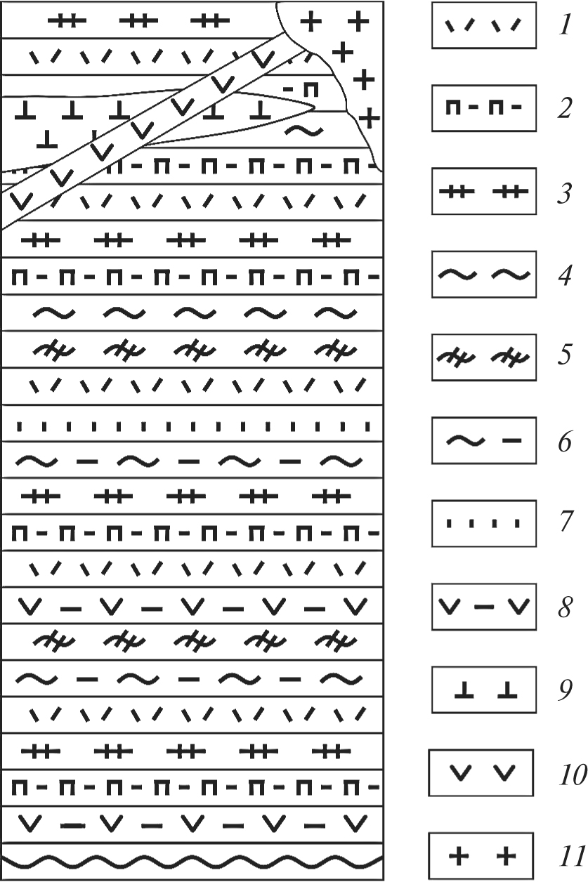 Рис. 2. Литологическая колонка наиболее представительных типов пород, вскрытых в скальных обнажениях на склонах цирка в верховьях первого левого притока р. Джархан-Сарыга. 1 – гнейсы гиперстен-двуполевошпатовые, 2 – кристаллические сланцы двупироксен-плагиоклазовые (метабазиты), 3 – ортогнейсы гиперстен-двуполевошпатовые высококалиевые и высокоториевые (чарнокитоиды), 4 – гнейсы биотит-гранатовые, 5 – кристаллические сланцы биотит-гиперстен-кордиерит-сапфириновые, 6 – кристаллические сланцы биотит-гранат-силлиманитовые, 7 – кварциты, полевошпатовые кварциты, 8 – плагиогнейсы гиперстеновые, 9 – метагаббро-диориты, метадиориты, 10 – метабазиты субщелочные из даек, 11 – граниты, субщелочные лейкограниты, пегматоидные образования.