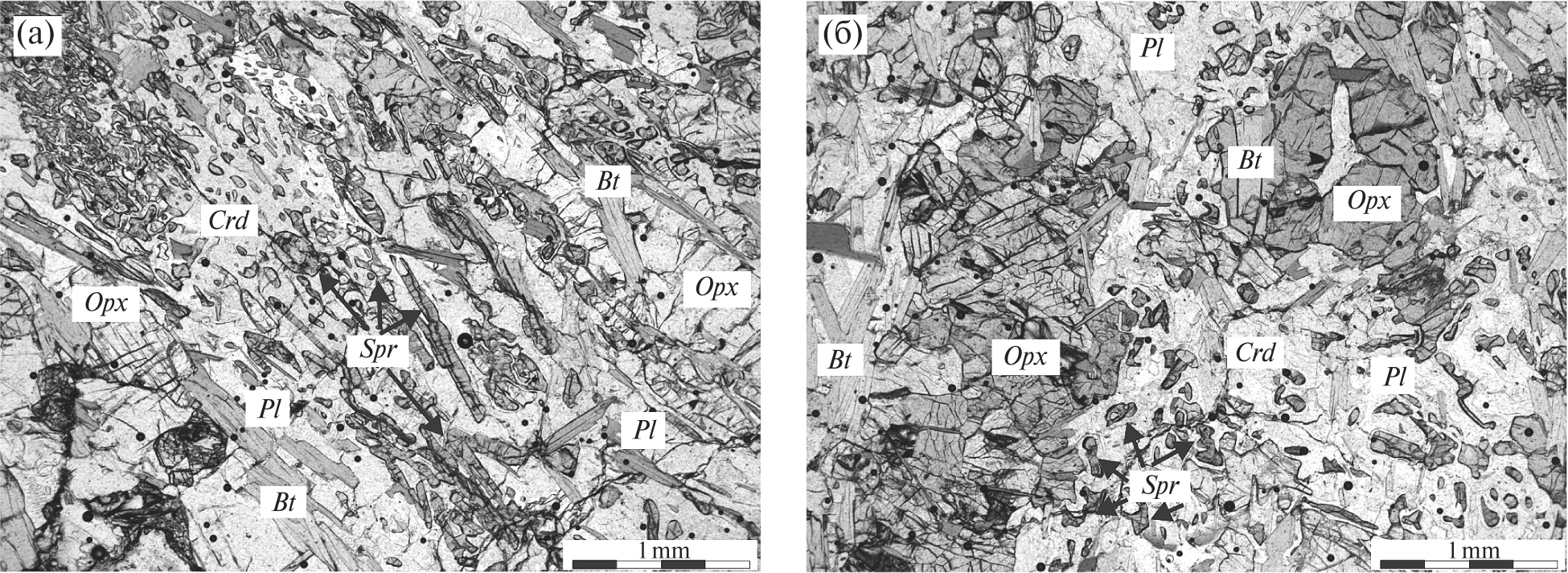 Рис. 3. Микрофотографии петрографических шлифов, показывающие взаимоотношения минералов в сапфиринсодержащих гранулитах: (a, обр. А-28-88) – с субпараллельной ориентировкой минералов, подчеркивающей кристаллизационную сланцеватость (гнейсовидность); (б, обр. А-68-88) – агрегаты минералов погружены в кордиеритовый матрикс.