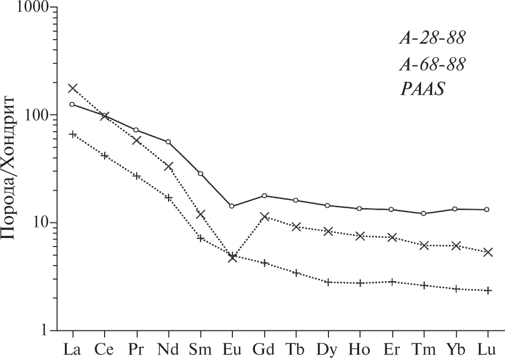По химическому составу (в мас.%) сапфиринсодержащие породы одновременно обогащены Al2O3 (19.8–26.7), MgO (16.9–18.7) и K2O (2.3–6.6) и обеднены SiO2 (41.2–49.3), TiO2 (0.38–0.55), CaO (0.15–1.0), Na2O (0.48–1.25) и P2O5 (0.03) (табл. 1) в сравнении с типичными PAAS метапелитами (Тейлор, Мак-Леннан, 1988). Среди элементов-примесей отмечаются высокие содержания (в г/т) Rb (250–300), Ba (690), Th (12–23) и особенно La (55) и Sm (2.3) относительно среднего состава постархейского австралийского сланца (PAAS) (Тейлор, Мак-Леннан, 1988). Спектр РЗЭ весьма дифференцирован [(La/Yb)n = 28–30] c глубоким Eu-минимумом (Eu/Eu* до 0.4) (рис. 4), что обусловлено фракционированием внутри континентальной коры, связанным с образованием в эпохи, предшествующие седиментации, богатых калиевых гранитов (Тейлор, Мак-Леннан, 1988). В целом, для этих пород характерно нормальное для осадочных пород отношение Th/Sc = 1–2. Повышенное значение La/Sc = 5.7 обусловлено аномальной концентрацией легких РЗЭ, а высокое Th/U = 11–25 отношение может быть вызвано выносом U при гранулитовом метаморфизме (Ножкин, Туркина, 1993).