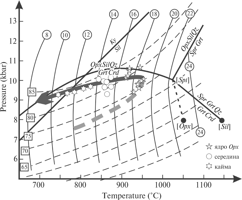 Высокие содержания Al2O3 в ортопироксенах (до 8.8 мас.%) указывают на ультравысокотемпературные (UHT) условия метаморфизма с температурами > 900°C(Harley, 2004), а композиционная зональность ортопироксенов позволила выделить два этапа метаморфизма: (1) короткий завершающий фрагмент прогрессивного этапа и (2) регрессивный этап с длинной Р-Т траекторией. Температуры и давления формирования гранулитов определялись по пересечению XAl и XMg изоплет зонального ортопироксена в разных частях зерен на основе P-T диаграммы (Harley, 2004). Дополнительно рассчитывались значения температур по содержанию Al2O3 в ортопироксене (Harley, Motoyoshi, 2000). Для оценки достоверности результатов геотермобарометрии эти значения сопоставлялись с оценками Р-Т условий, полученными с помощью компьютерной программы THERMOCALC 3.33 (Powell, Holland, 1994).