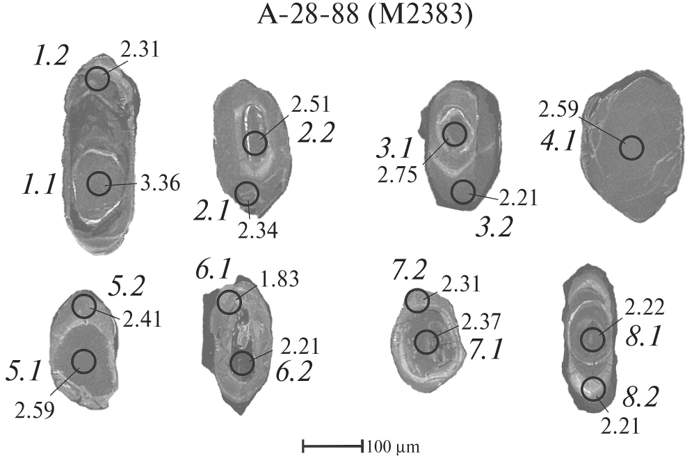 Для изотопно-геохронологических исследований был выделен циркон из пробы (А-28-88) сапфиринсодержащего сланца (Би-Гип-Корд-Сапф-Сил), отобранного из скального обнажения на СЗ склоне цирка в истоках ручья Джархан-Сарыга. На ионном микрозонде SHRIMP-II проанализировано 8 зерен циркона в 15 точках (табл. 3). Размеры зерен варьируют от 200 до 50 мкм. Циркон представлен идиоморфными призматически-дипирамидальными и субидиоморфными светло-коричневыми кристаллами со сглаженными ребрами и коэффициентом удлинения 1.5–4. Реже наблюдаются более густо окрашенные изометричные зерна. В катодолюминесцентном изображении цирконы в большинстве случаев зональны с четко выраженными ядром и каймами (рис. 6). Ядра представлены призматическими и изометрическими грубозональными или однородными кристаллами. Оболочки имеют однородное, реже зональное строение. Для разграничения генераций циркона магматогенного и метаморфического генезиса использовалась информация о морфологии и внутренней структуре зерен наряду с данными торий-урановых отношений (Бибикова и др., 1988; Каулина, 2010). Поскольку возраст гранулитов явно более 1 млрд лет, то для интерпретации использованы определения 207Pb/206Pb возраста для цирконов с дискордантностью менее 10%.