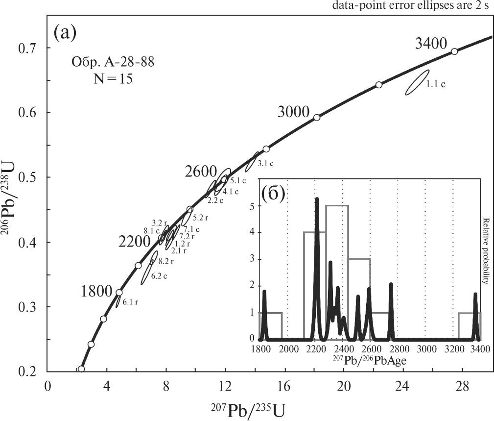 Таблица 3. Результаты изотопного анализа и возраст цирконов из пробы (А-28-88) сапфиринсодержащего сланца Анабарского щита