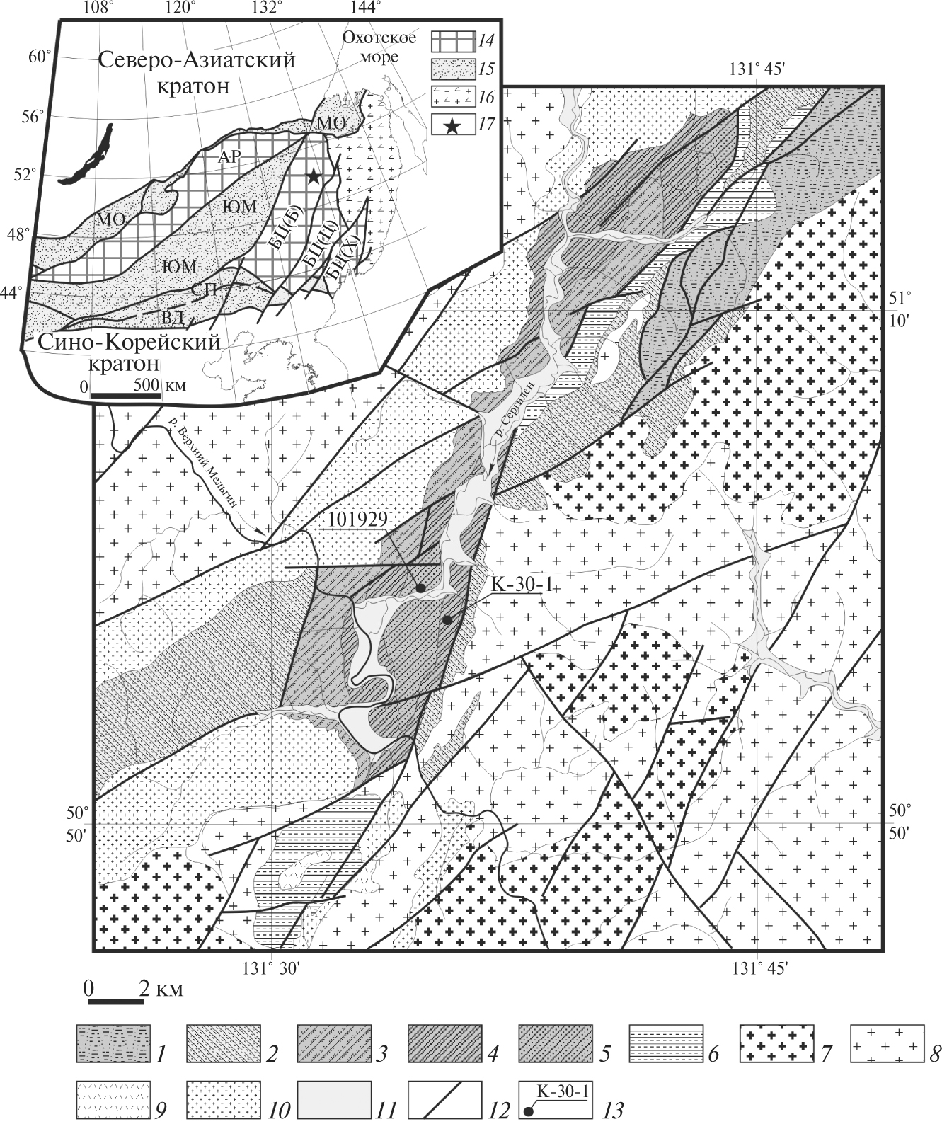 Рис. 1. Схематическая геологическая карта фрагмента Буреинского континентального массива (бассейн р. Верхний Мельгин). Составлена по (Амелин, 2016) с упрощениями авторов. 1 – сланцы слюдистые, часто углеродистые с пластами кварцитов и мраморов условно средне-верхнерифейской нятыгранской свиты; 2 – метапесчаники, метаалевролиты, филлиты условно верхнерифейской туранской серии; 3–5 – терригенно-карбонатные отложения Мельгинского прогиба: 3 – известняки, иногда мраморизованные, доломитизированные вендской мельгинской свиты, 4 – углисто-глинистые, известково-глинистые, серицит-кремнистые сланцы, алевролиты, песчаники, известняки нижнекембрийской чергиленской свиты, 5 – песчаники с прослоями гравелитов и конгломератов нижнекембрийской аллинской свиты; 6 – туфы кислого состава, риолиты и их лавобрекчии условно нижнекаменноугольной амганской свиты; 7 – гранитоиды условно раннепалеозойских кивилийского и суларинского комплексов; 8 – гранитоиды условно позднепалеозойского тырмобуреинского комплекса; 9 – риолиты, трахириолиты средне-позднетриасового таловского комплекса; 10 – гранитоиды позднетриасового–раннеюрского харинского комплекса; 11 – кайнозойские рыхлые отложения; 12 – разломы; 13 – места отбора образцов для геохронологических исследований и их номера. На врезке показано положение исследуемого объекта в структуре восточной части Центрально-Азиатского складчатого пояса [тектоническая основа по (Парфенов и др., 2003)]: 14 – континентальные массивы (супертеррейны): АР – Аргунский, БЦ – Бурея-Цзямусинский (БЦ(Б) – Буреинский террейн, БЦ(Ц) – Цзямусинский террейн, БЦ(Х) – Ханкайский террейн); 15 – палеозойские-раннемезозойские складчатые пояса: ЮМ – Южно-Монгольско-Хинганский, СЛ – Солонкерский, ВД – Вундурмиао, МО – Монголо-Охотский; 16 – позднеюрско-раннемеловые орогенные пояса; 17 – положение объекта исследования.
