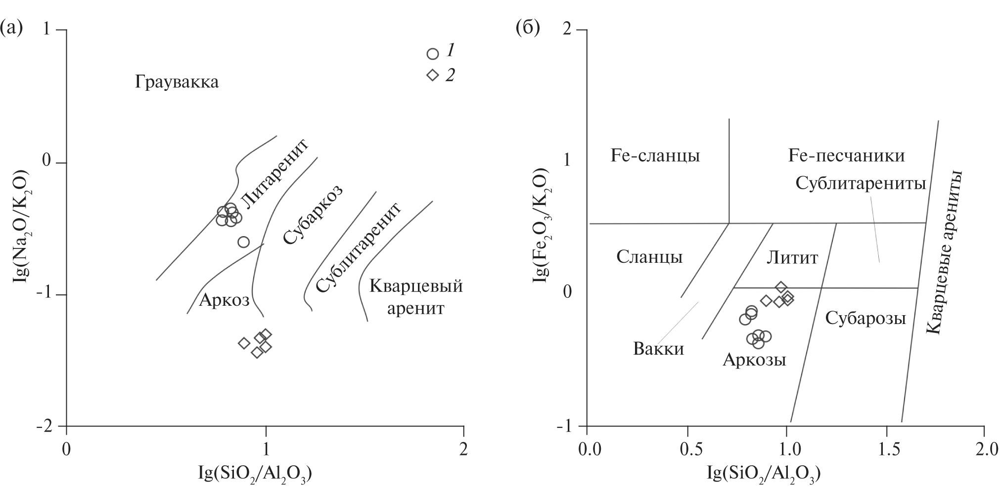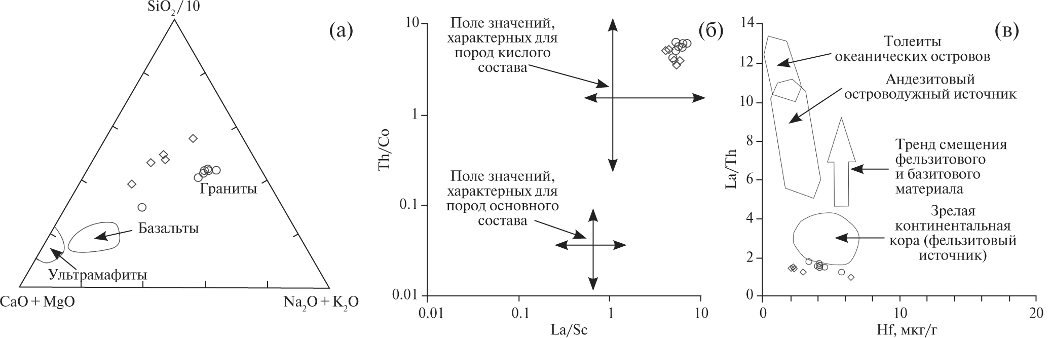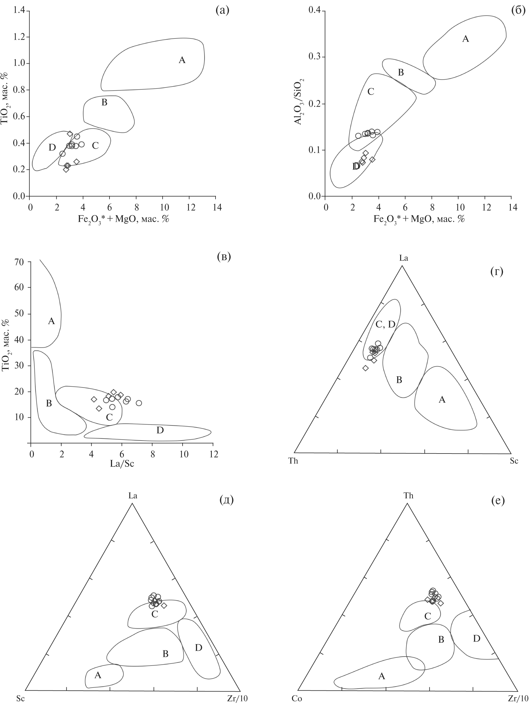 Наиболее многочисленная группа представлена цирконами позднерифейского возраста (пики 0.78, 0.82, 0.94, 1.04 млрд лет). К настоящему времени установлено, что в строении Буреинского массива принимают участие породы габбро-гранитной (940–933 млн лет) и гранит-лейкогранитной (804–789 млн лет) ассоциаций (Сорокин и др., 2016, 2017). Вероятно, такие или подобные комплексы пород и являлись источниками цирконов соответствующего возраста в кембрийских песчаниках. С этим согласуются высокие содержания SiO2, Th, легких РЗЭ и относительно низкие содержания CaO, MgO, Co, V, Ni, Sc (рис. 4, 5) в кембрийских осадочных породах, свидетельствующие о преимущественно “гранитоидном” источнике кластического материала.