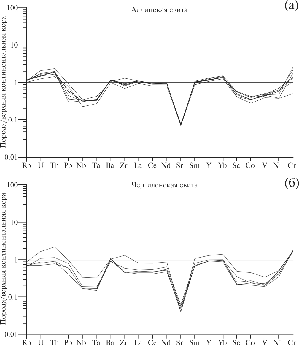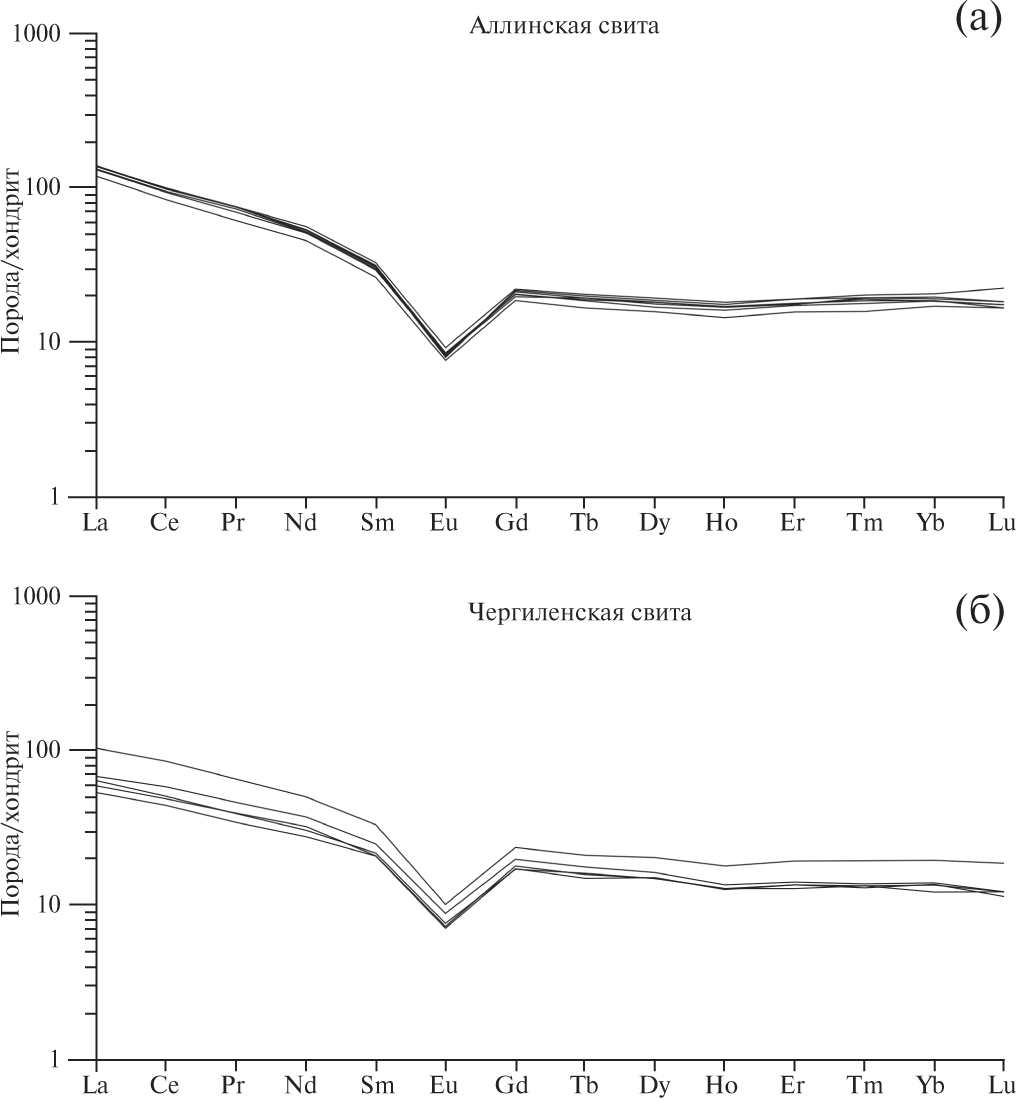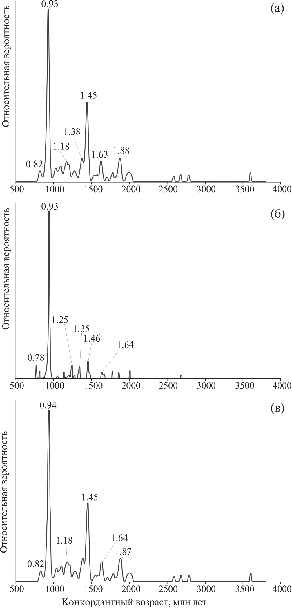 Результаты выполненных U-Th-Pb геохронологических (LA-ICP-MS) исследований детритовых цирконов из песчаников чергиленской и аллинской свит позволяют выделить пики возрастов на кривой вероятности около 0.78, 0.82, 0.94, 1.04, 1.10, 1.14, 1.18, 1.20, 1.25, 1.28, 1.34, 1.38, 1.45, 1.64, 1.78, 1.87 и 2.01 млрд лет (рис. 8в).