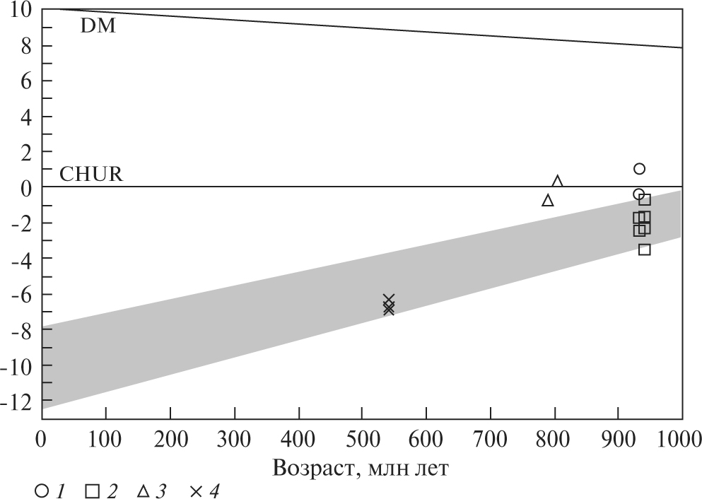 Результаты Sm-Nd изотопно-геохимических исследований (рис. 7) в совокупности с геохронологическими данными показывают, что источником сноса для кембрийских осадков Мельгинского прогиба могли являться рифейские магматические комплексы, возникшие за счет переработки предположительно раннепротерозойских образований. Примечательно, что фигуративные точки изотопного состава Nd кембрийских песчаников Мельгинского прогиба находятся в поле изотопной эволюции Nd позднерифейских (940–933 млн лет) гранитоидов (рис. 7) и имеют близкие значения Nd-модельных возрастов.
