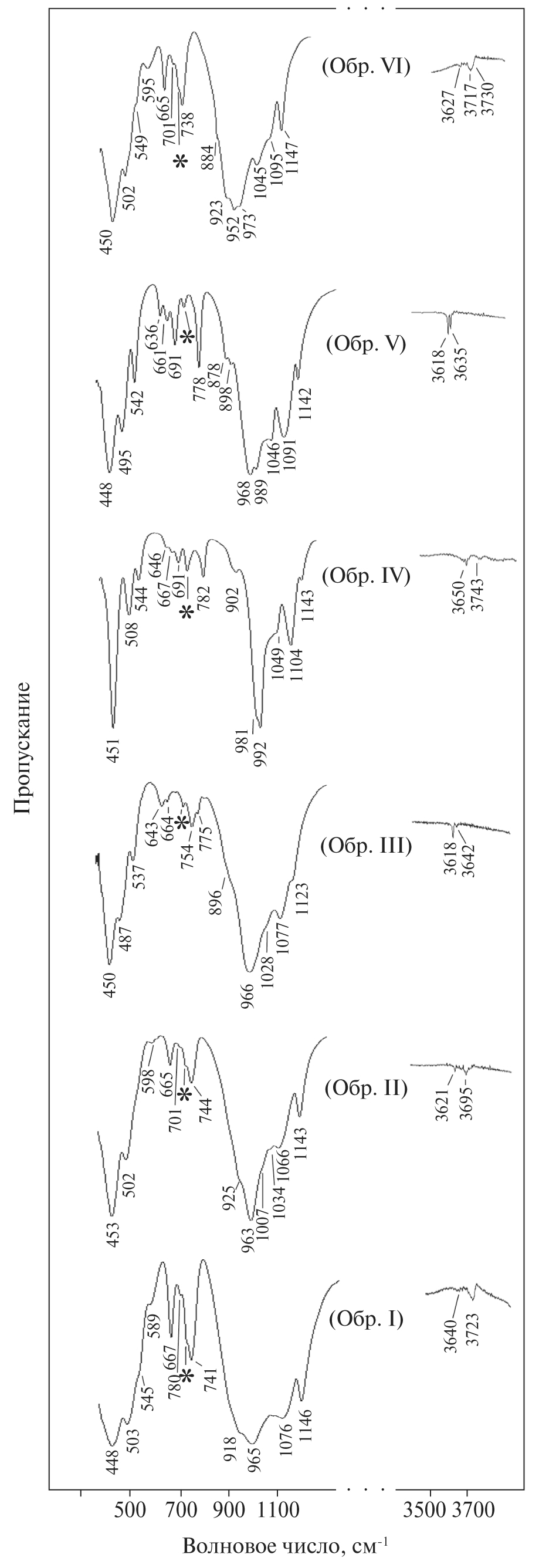 Натриевые и натриево-кальциевые амфиболы, относящиеся к моноклинной сингонии, характеризуются большим разнообразием катионного состава с постепенными непрерывными переходами внутри изоморфных рядов и между ними. В связи с этим их спектры инфракрасного поглощения (рисунок) сходны по общему профилю, но имеют индивидуальные особенности в форме профиля отдельных спектральных областей. Высокочастотная область спектров 3600–3750 см-1, соответствующая валентным колебаниям гидроксильных групп, представлена двумя-тремя слабоинтенсивными полосами поглощения, частоты которых варьируют в зависимости от заполнения октаэдрических [M(1) и M(3)] позиций. В спектральной области 800–1200 см-1, относящейся к валентным колебаниям O-Si-O (O-Al-O) c немостиковым кислородом, зарегистрирована широкая полоса поглощения сложной формы, в контуре которой выделяется от четырех (обр. I) до семи (обр. V и VI) спектральных компонент. Область от ~580 до 800 см-1, приписываемая поглощению деформационными колебаниями Si-O-Si(Al-O-Si) с мостиковым кислородом, характеризуется набором из четырех спектральных компонент с различными относительными интенсивностями. Низкочастотная область 400–580 см-1 соответствует поглощению трансляционными колебаниями катионов, занимающих не тетраэдрические позиции в структуре. С учетом спектральных особенностей исследованные образцы могут быть идентифицированы согласно, (Chukanov, 2014; Chukanov, Chervonnyi, 2016), как: образцы I и II – магнезиоарфведсонит (спектр № Sib6, Ильмены, Южный Урал, Россия), образец III – арфведсонит (№ Sib5, Ловозеро, Карелия, Россия), образец IV – магнезиорибекит (№ Sib52, Онежское озеро, Карелия, Россия), образец V – рибекит (№ Sin147, Трансвааль, ЮАР), образец VI – рихтерит (№ Sib65, Вермланд, Швеция).