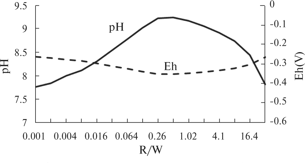 Как видно из рис. 1, кислота по мере образования нейтрализуется минералами породы. При любом водообмене (отношении R/W) pH дренажных вод выше нейтрального значения 7.