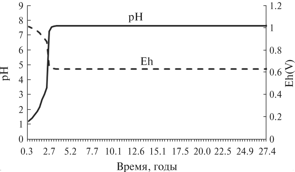 Рис. 2. Зависимость Eh-pH условий дренажных вод от времени взаимодействия с рудовмещающей породой (при R/W=0.0003, P O2=10-1 бар и Р СО2=10-3 бар).
