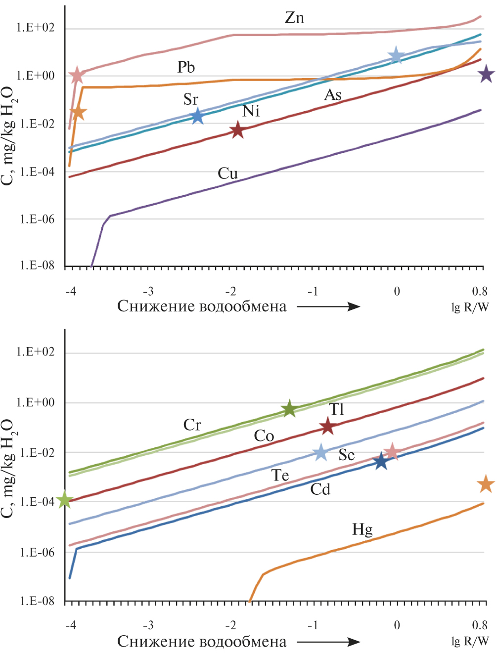 Одновременно моделирование показало, что в водах месторождения Павловское превышение ПДК (ГН 2.1.5.1315-03) рядом нормируемых элементов является закономерным. На рис. 3 визуализирован процесс накопления токсичных компонентов в водной фазе при росте модельного параметра R/W, имитирующего постепенное снижение скорости водообмена в системе вода–порода. Так, уже при значении R/W=0.0001 Pb и Znначинают превышать в водной фазе свои предельно допустимые концентрации. При R/Wна два порядка больше, т.е. 0.01, к ним присоединяются Ni и As, на три – Cr, Co, Se, на четыре и больше – Sr, Te, Cd, Cu и Hg.