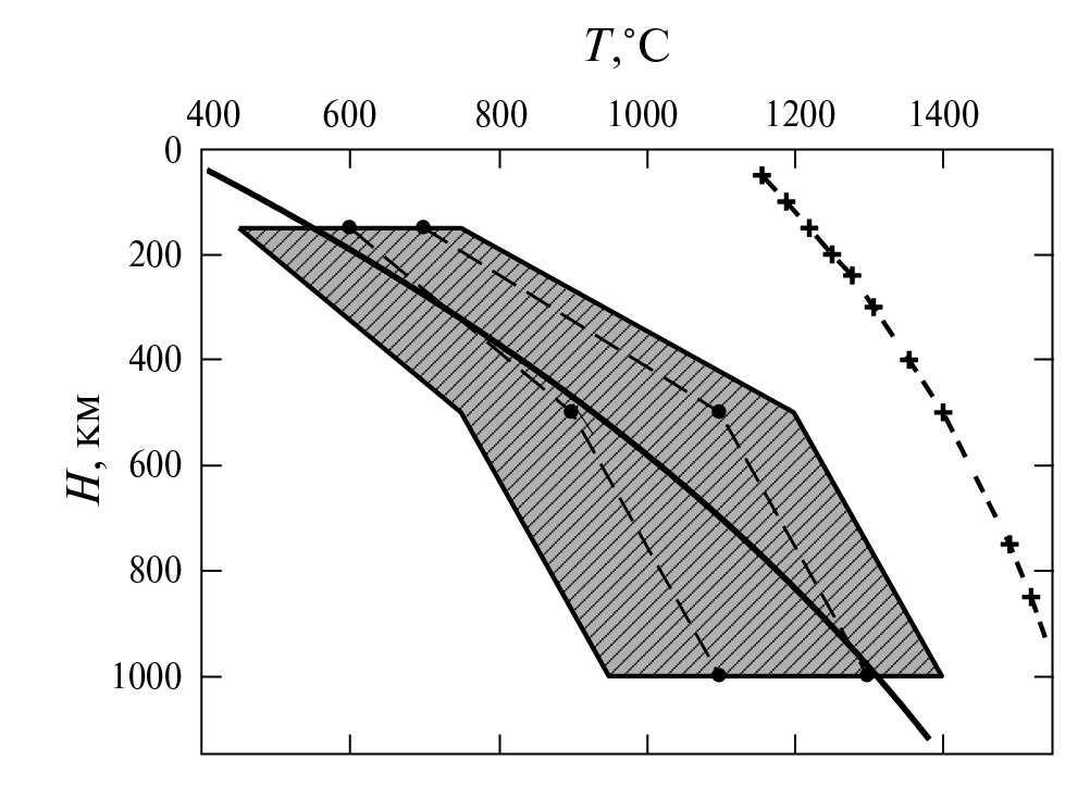 По совокупности литературных данных диапазон температур в мантии покрывает область, удовлетворяющую ограничениям (рис. 1)
