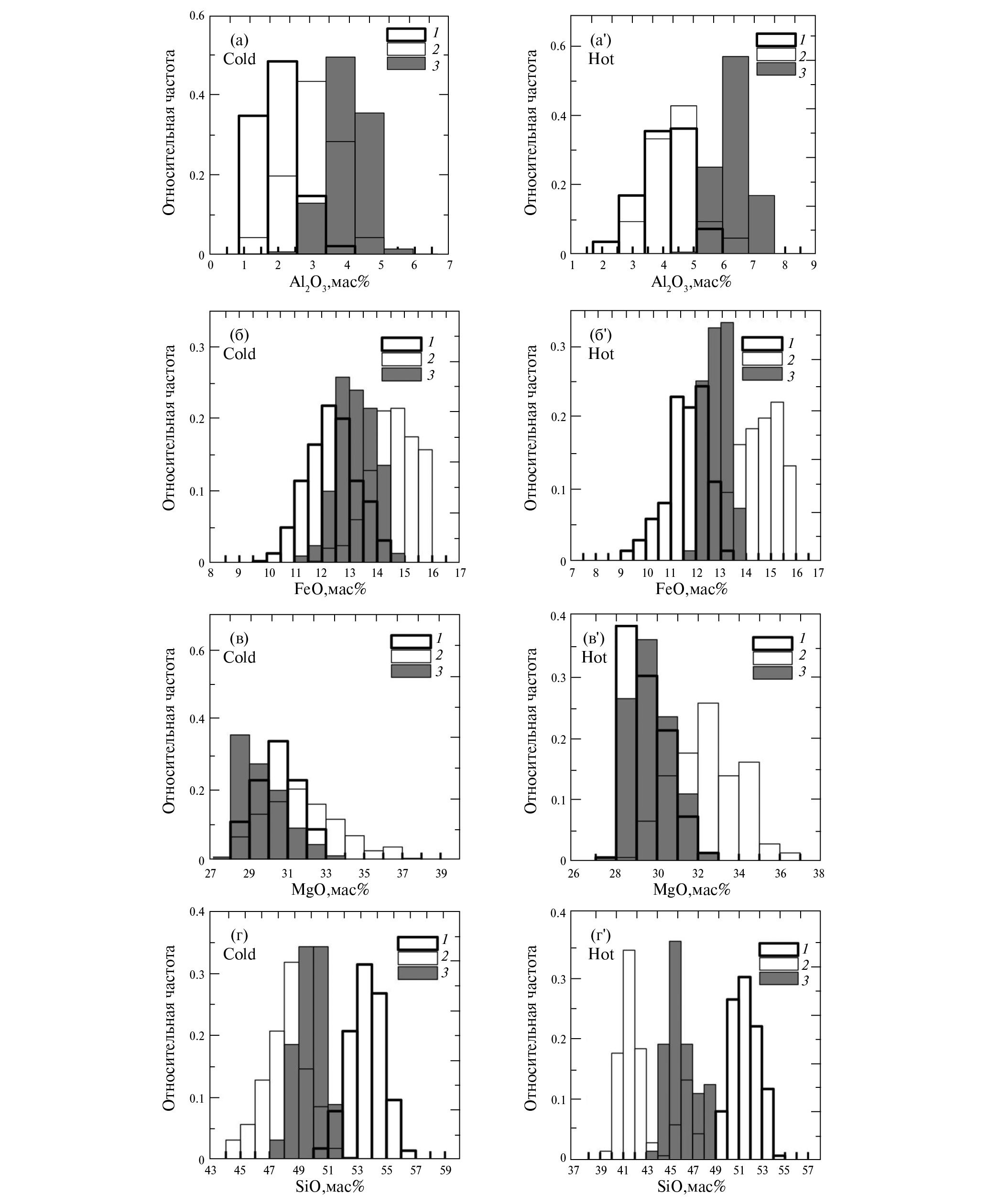 По гистограммам (рис. 2a, а´) видно, что концентрации C(Al2O3) увеличиваются от 1–5% в верхней и средней мантии до 4–7 мас.% в нижней мантии, причем для горячей модели C(Al2O3) во всех трех зонах мантии выше, чем для холодной. Напротив, вне зависимости от температуры содержания FeO ~11–14% (рис. 2б, б´) и MgO ~28–31 мас.% (рис. 2в, в´) достаточно стабильны в верхней и нижней мантии. Средняя мантия, вероятно, имеет несколько более железистый состав (вплоть до ~15 мас.% FeO), что может быть связано со слабым уменьшением скорости S-волн по модели (Gagnepain-Beyneix et al., 2006) и существованием слоя повышенной проводимости на глубинах >200 км (Дайел et al., 1975).