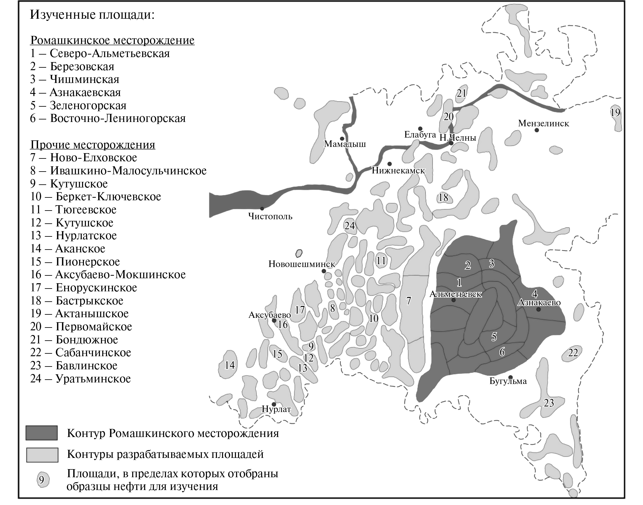 Вместе с тем на территории Татарстана в карбонатных отложениях верхнего девона в пределах Южно-Татарского свода нами была найдена большая группа ароматических соединений – свидетелей аноксии в фотическом слое бассейна седиментации (Полудеткина и др., 2017; Смирнов и др., 2018). То же было обнаружено в ряде образцов нефтей Ромашкинского месторождения (Смирнов, Полудеткина, 2018). Эти соединения вместе с методами их идентификации детально описаны в (Koopman et al., 1996; Clifford et al., 1998). Естественно возникла необходимость выяснить, насколько данная группа компонентов характерна для нефтей Татарстана в целом и, соответственно, можно ли исходя из концентраций и состава этих маркеров реконструировать особенности условий нефтегенерации и осадконакопления материнских пород.