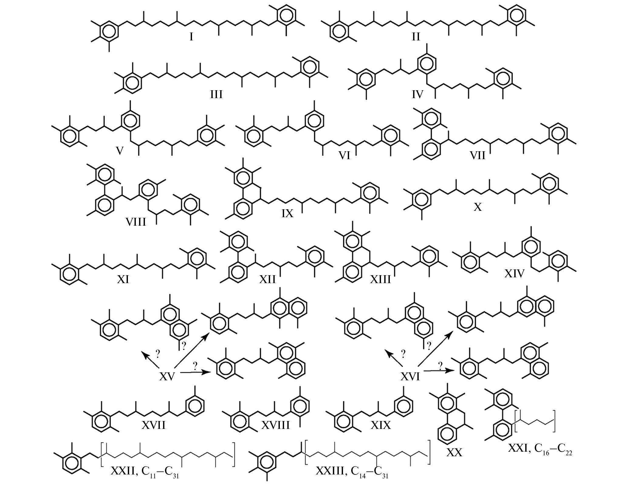 Во всех изученных фракциях ароматических соединений обнаружено более 50 компонентов от С11 до С40 – свидетелей аноксии в фотическом слое бассейна седиментации (рис. 2). Только в одном образце найдено единственное соединение с характеристическим ионом m/z = 287, концентрация которого была крайне мала. Поэтому на рис. 2 оно не приведено. Эти соединения на основании приведенных в (Koopman et al., 1996; Clifford et al., 1998) схем их вероятного образования сгруппированы следующим образом: