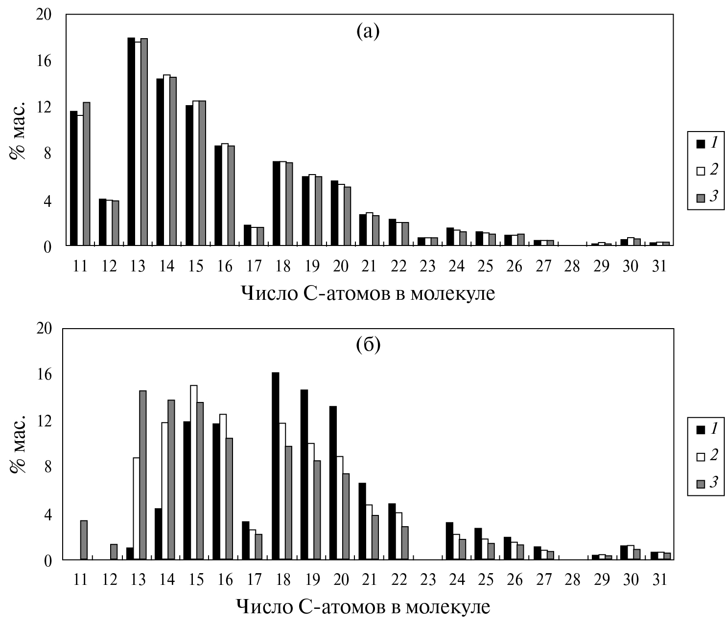 Рис. 3. Молекулярно-массовые распределения (ММР) соединений группы 6, полученные для сырых нефтей (а) и выделенных из них фракций (б). 1 – максимум ММР при анализе фракции приходится на С18; 2 – на С15; 3 – на С13. По оси ординат «% мас.» – от общего содержания компонентов данной группы.