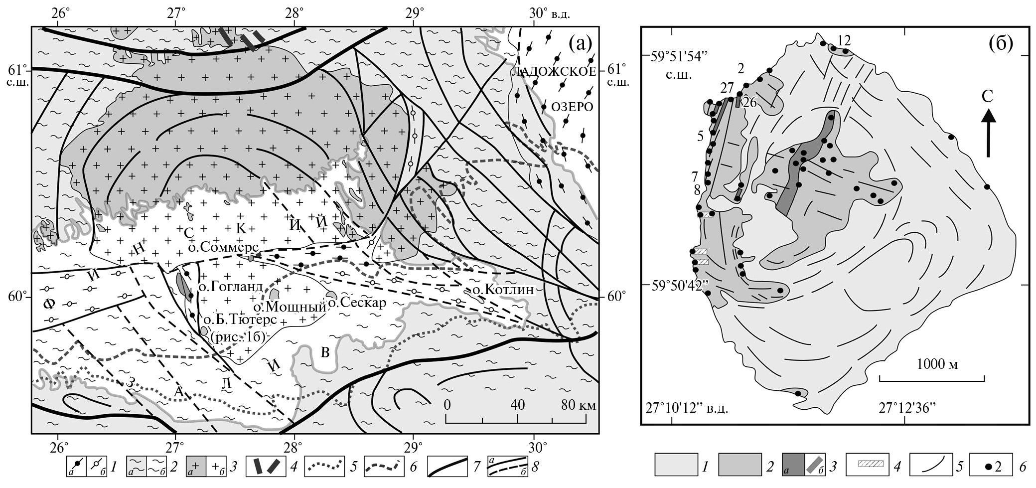 Рис. 1. Структурная схема Финского залива (а) и детальная геологическая карта о. Большой Тютерс (б). В (а): 1 – рифейские отложения: а – достоверные, б – предполагаемые; 2 – свекофеннский комплекс, сланцы, мигматиты, амфиболиты (1,95–1,85 млрд лет) – фундамент для рифейских образований: а – на суше, б – в акватории Финского залива; 3 – граниты рапакиви Выборгского массива (1,65 млрд лет): а – на суше, б – в акватории Финского залива; 4 – дайковые комплексы в обрамлении Выборгского массива (кварцевые порфиры); 5 – подошва палеозойских отложений Русской плиты; 6 – подошва вендских отложений; 7 – краевые ограничения линеаментной зоны Полканова; 8 – разломы и структурные элементы, дешифрируемые на космических снимках (а – достоверные, б – предполагаемые). В (б): 1 – четвертичные отложения; 2 – вторичные кварциты (по свекофеннским сланцам); 3 – крупнозернистые рапакивиподобные граниты (а– массив, б – дайки); 4 – дайки липарит-гранитов; 5 – структурные элементы дешифрируемые на космических снимках, в том числе и зоны железисто-глиноземистых метасоматитов (на площади вторичных кварцитов); 6 – точки наблюдений и их номера.