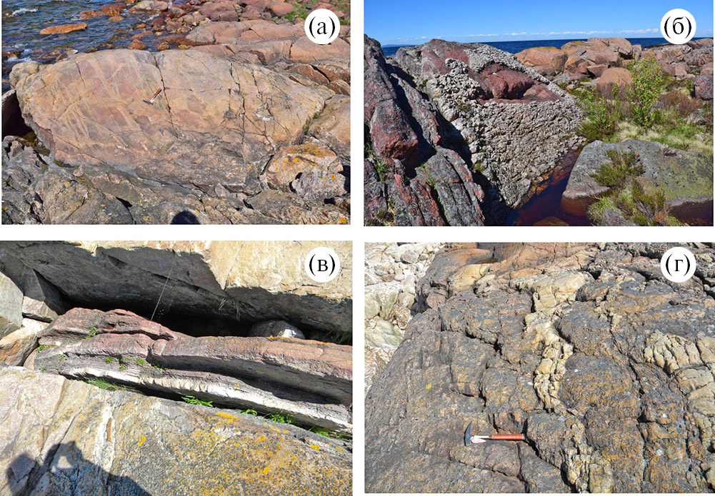 Рис. 2. Фотографии обнажений горных пород с о. Б. Тютерс: (а) – вторичные кварциты с теневыми реликтами мигматизированных гнейсов свекофенс-кого возраста; (б) – наклонные кварцевые жилы среди вторичных кварцитов; (в) – зона железо-глиноземистых метасоматитов; (г) – дайка флюидальных гранит-порфиров, секущих вторичные кварциты.