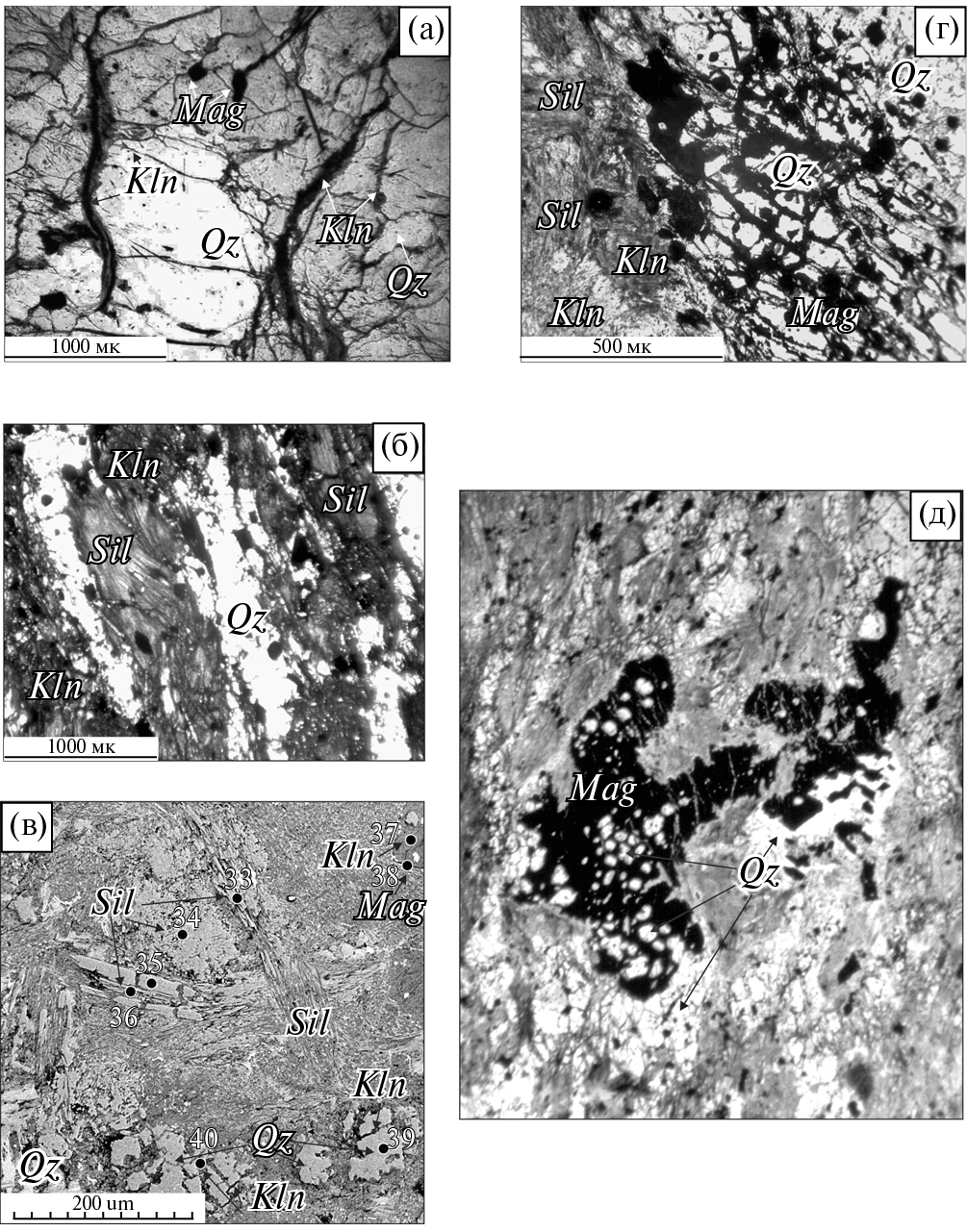 Рис.3. Микрофотографии, иллюстрирующие развитие метасоматитов по вторичным кварцитам: (а, б, г, д) – фотографии шлифов, сделанные под микроскопом, все – без анализатора: (а) – кварцит крупнозернистый с субпараллельными трещинами с каолинитом – начало образования метасоматита; (б) – метасоматит разгнейсованный с участками мелкораздробленного реликтоваго кварца в виде полос. В поле зрения – пластинки силлиманита, изометричные агрегаты каолинита; (в) – фото на микрозонде, участок метасоматита существенно каолинитового состава, в котором различаются пластинки силлиманита и в нижней части фотографии – микрообломки реликтового кварца; (г) – микрообломки кварца обволакиваются рудным веществом, местами сгруппированным в скелетные зерна рудного минерала с заключенными в них обломками кварца; (д) – сформированное крупное зерно магнетита в метасоматите в окружении мелкодробленого кварца и с мелкими включениями кварцевых обломков, часть из которых перекристаллизована и имеет вид кристаллов.