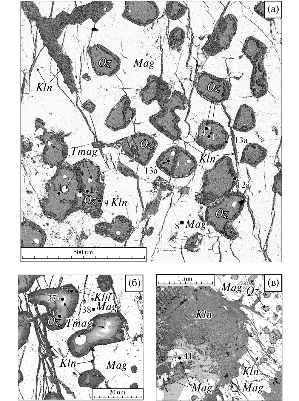 Рис. 4. Микрофотографии метасоматитов (сделаны на микрозонде): (а) – фрагмент крупного зерна магнетита (белое поле), показанного на рис. 3д, с включениями кварца, содержащими мелкие кристаллики титаномагнетита. Зерна кварца имеют каолинитовые каемки и связаны между собой микротрещинами, также выполненными каолинитом; (б) – деталь рис. 4а, на которой кварцевые включения сохранили форму обломков, но приобрели полигональные очертания, в них видны гексагональные кристаллики титаномагнетита, в магнетите – пучки трещин; (в) – фрагмент метасоматита, обогащенного каолинитом с отходящей от него в магнетит системой трещин с каолинитом. В нижней части – пластинка мусковита. На фото, сделанных под микроскопом, кварц имеет белый цвет, магнетит – черный, а на микрозонде – кварц – серый, каолинит – темно-серый, а рудные минералы – белого цвета.