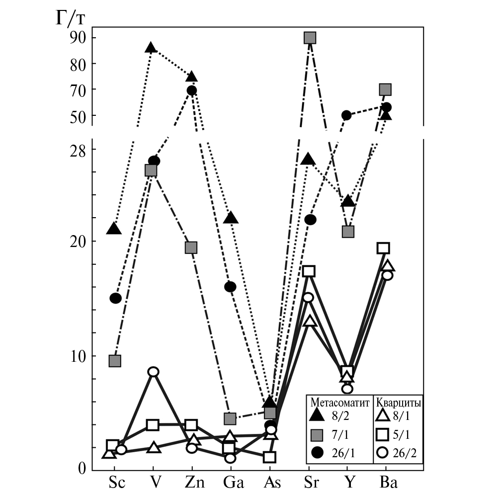В изученных породах – кварцитах и метасоматитах – определено содержание большой группы элементов-примесей. При сравнении количества этих элементов в метасоматитах и кварцитах установлено, что метасоматиты значительно (в 3–10 раз) обогащены рядом элементов. Особенно высоким содержанием отличается Zr (146-199 г/т). В метасоматитах также больше V, Zn, Ba, Sr, Ga, As, Y. При этом отмечается несколько варьирующее содержание отдельных элементов в разных пробах метасоматитов. Для кварцитов, напротив, характерно довольно однородное распределение этих элементов (табл. 5; рис. 5).
