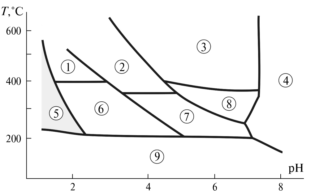 Рис. 7. Расположение пород разного типа на диаграмме Т°С – рН. 1 – грейзены, 2 – кварц-полевошпатовые метасоматиты, 3 – скарны, 4 – щелочные метасоматиты, 5 – вторичные кварциты, 6 – березиты, 7 – гумбеиты, 8 – пропилиты, 9 – аргиллиты (по Мишину, Бердникову, 2003).