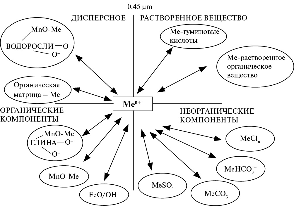 Ионы металлов находятся в равновесном состоянии в воде с различными неорганическими и органическими соединениями (с аминами, гумусовыми кислотами и другой органикой), а также сорбированные на взвесях (Bjerregaard, Andersen, 2014). Поверхности неорганических частиц (наночастицы глины, оксиды марганца и железа) и органических неклеточных микрообъектов (сифонниковые водоросли, плазмодии миксомицеты, фикомицеты и др.) имеют доминирующие O− фрагменты. В зависимости от сродства конкретных ионов металлов к концевым отрицательно заряженным ионам кислорода (карбоксильные, гидроксильные группы) на поверхности частиц, равновесие между свободными акваионами металлов будет нарушаться в сторону адсорбированных металлов. Общее представление о формах нахождения металлов в воде представлено на рис. 1.