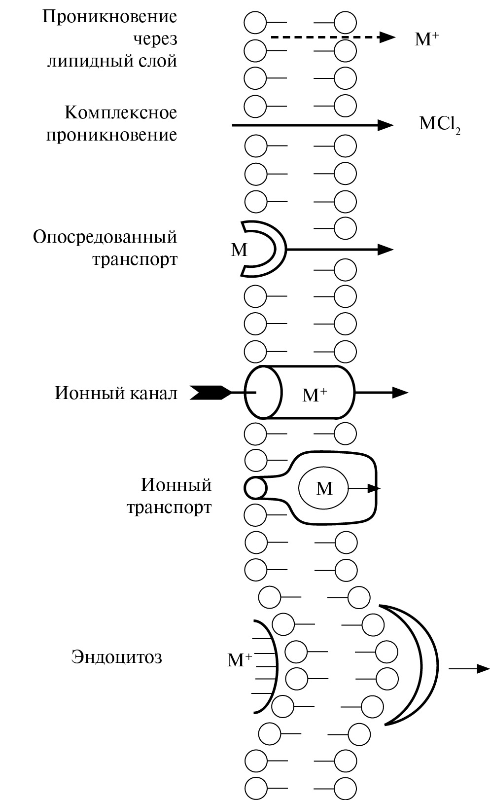 Клеточные мембраны играют ключевую роль в регуляции проникновения металлов в клетку и организм. (Simkiss, Taylor, 1989) на основе анализа результатов многочисленных исследований выделили возможные пути поглощения металлов водными организмами (рис. 2). Проникновение токсичных металлов в клетку может происходить по следующим каналам.