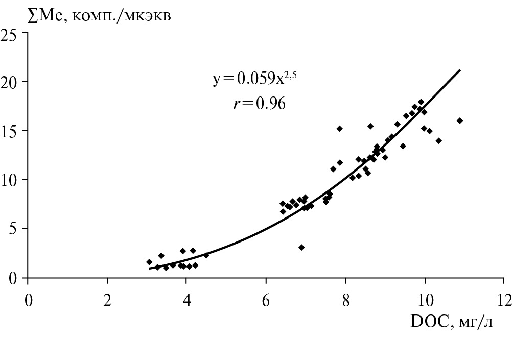 На территории всей гумидной зоны в России распространены «цветные» воды с высоким содержанием природного органического вещества гумусовой природы, которое потенциально, будет снижать экотоксичность металлов. Скорости реакции между свободными ионами металлов и органическими лигандами очень быстрые (Merrington et al., 2016). На основе исследования 64 водных проб из различных озер была получена зависимость между суммой металлов (в микроэквивалентах), связанных с органическими лигандами (ΣСнелаб) и содержанием органического вещества (DOC). Предполагалось, что все краевые центры органических лигандов связаны с металлами, поскольку в этих водных образцах присутствовали и свободные ионы металлов. Полученная зависимость аппроксимировалась степенным уравнением (рис. 3):