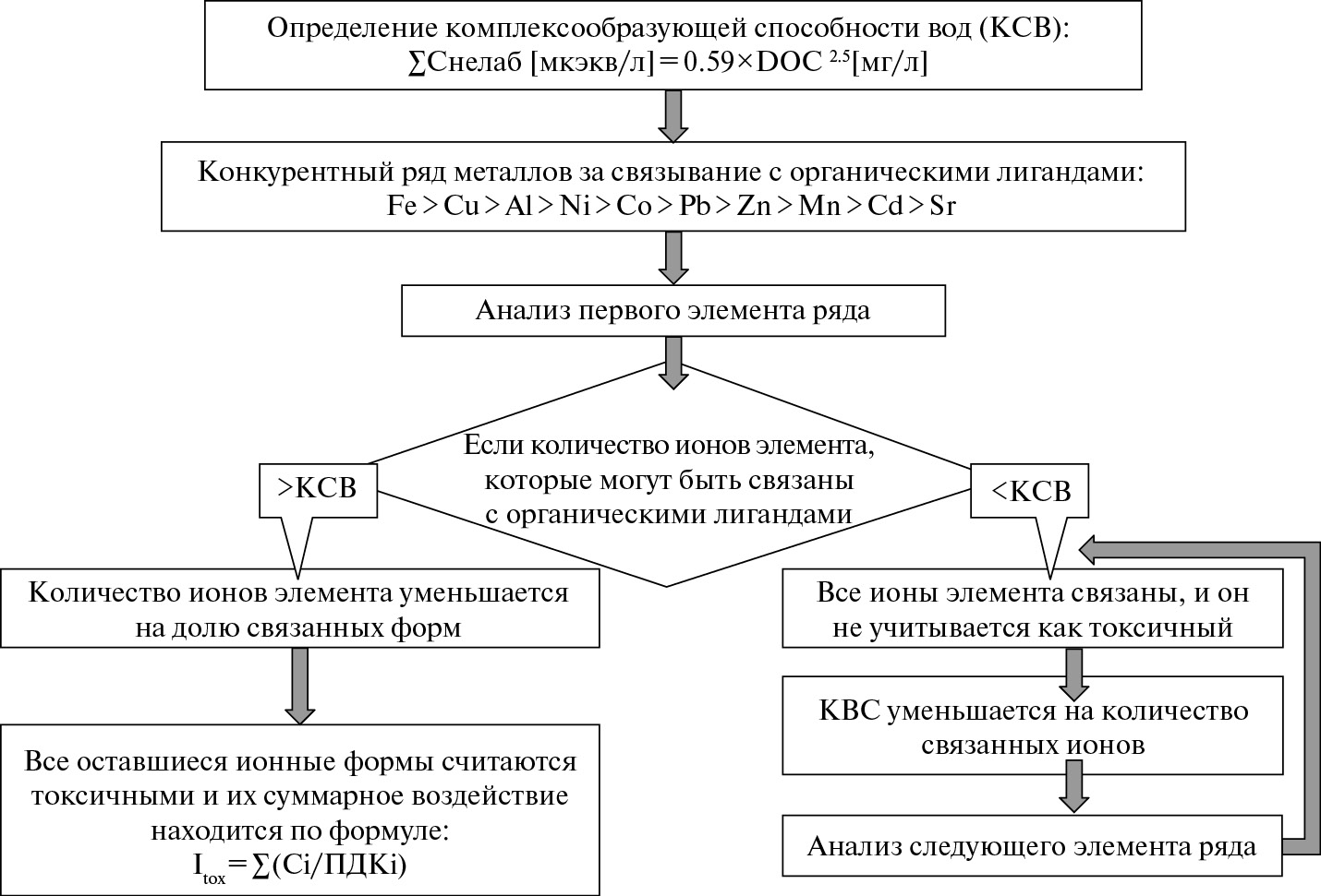 Исходя из изложенных результатов исследований и полученных коэффициентов, разработан алгоритм вычисления суммарного индекса токсичности водной среды (Itox), в котором учтены процессы связывания металлов органическим веществом, сродство различных металлов к реакциям комплексообразования и их относительная токсичность. Данные о токсичных свойствах элементов с определенной долей условности, как выше упоминалось, дают информацию ПДК.
