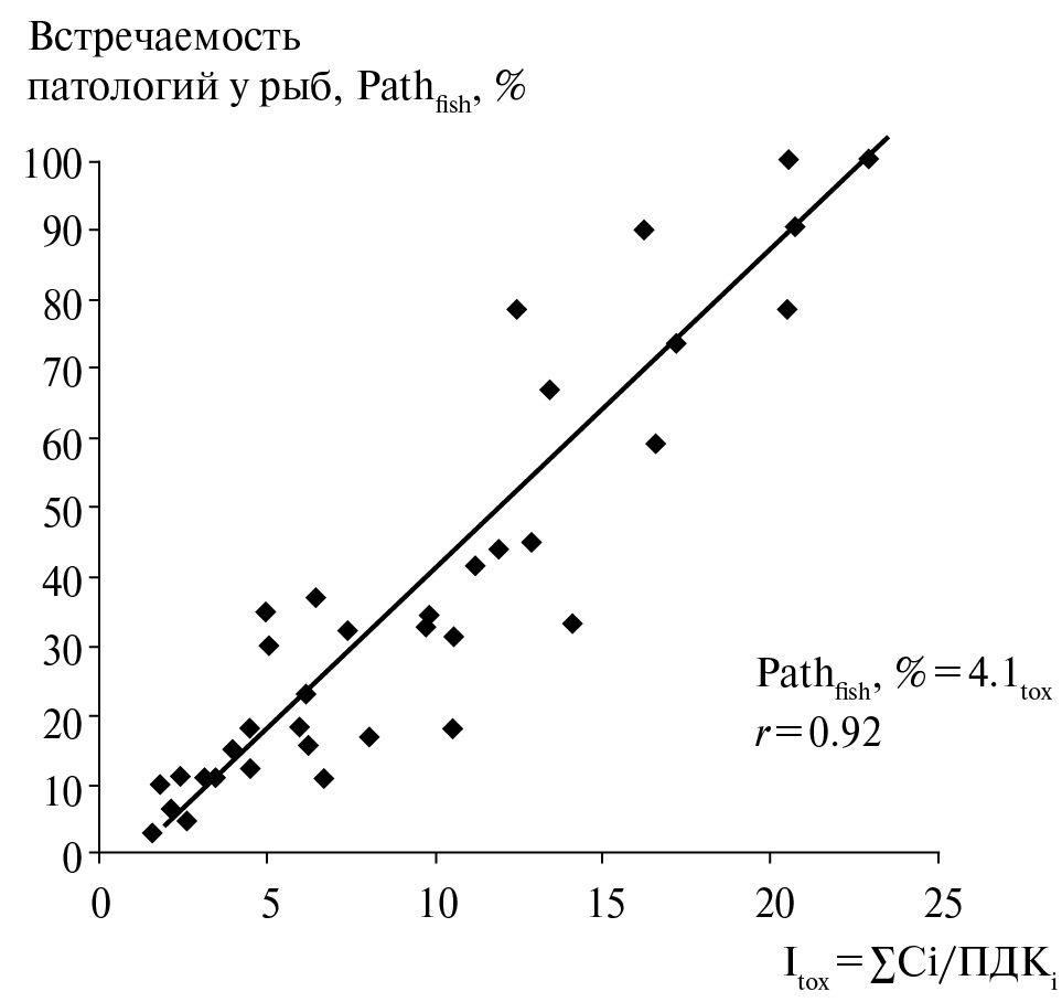 Для 37 водных объектов, различающихся уровнем загрязнения вод металлами и имеющими различное содержание органического вещества, исследовано состояние здоровья рыб по клиническим, патологоанатомическим и гематологическим показателям их интоксикации. Получена доза-эффектная зависимость между показателем Itox, рассчитанным предлагаемым нами методом, и заболеваемостью рыб (процент заболеваний в конкретном водоеме или районе загрязнения, Path, %) в водоеме: