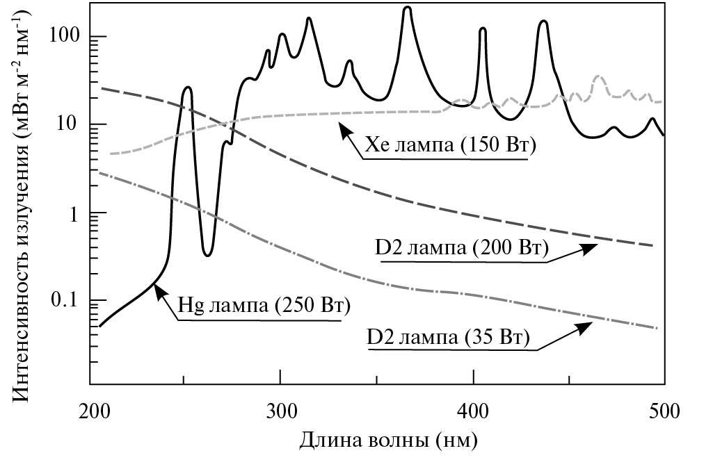 В качестве источника излучения была применена ртутная лампа (Hg лампа) высокого давления мощностью 250 Вт, которая была расположена на расстоянии около 50 см от боковой поверхности реакционной трубки. Ртутная лампа является эффективными источником излучения широкого диапазона длин волн – от 180 до 2000 нм. Спектральное распределение излучения Hg лампы показано на рис. 1. Широкополосная Hg лампа обладает высокой интенсивностью излучения в диапазоне 250−330 нм и очень слабой в диапазоне 190−250 нм, разница составляет более трех порядков. Это является принципиальным отличием Hg лампы от Xe и D2 ламп, интенсивность излучения у которых распределена более равномерно во всем диапазоне от 190 до 330 нм (рис. 1).