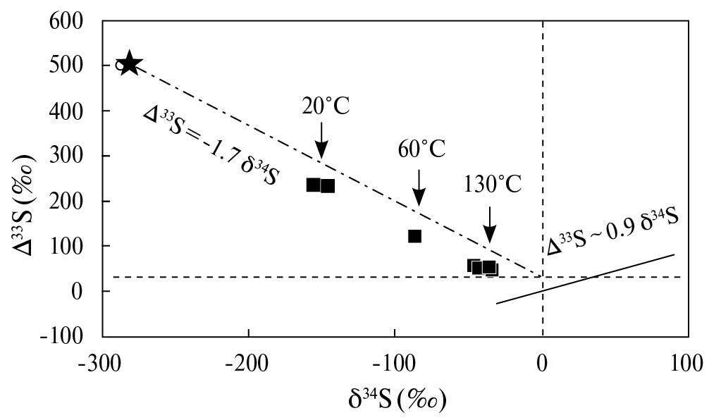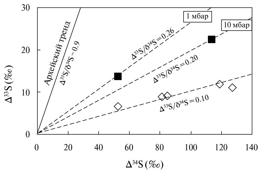 Обнаруженный наклон ∆33S/δ34S = 0.26, однако, не достигает того значения, которое свойственно архейскому тренду ∆33S/δ34S ~0.9. Вместе с тем необходимо обратить внимание на одно важное обстоятельство: магнитуда сигнала ∆33S в наших экспериментах удовлетворительно согласуется с наблюдаемыми значениями ∆33S в архейских породах, где ∆33S достигает 15‰. В этом случае высокие значения δ34S, полученные для S0, дают, соответственно, заниженные значения ∆33S/δ34S по сравнению с архейскими ∆33S/δ34S. В наших экспериментах δ34S имели значения от 52.5‰ до 114.3‰ (при рSО2 = 1–10 мбар), что существенно выше, чем δ34S в архейских породах, где δ34S не больше 20‰. Характер и магнитуда фракционирования серы зависят от ряда факторов, в том числе от температурных условий, а также наличия и соотношения некоторых компонентов в газовой фазе, участвующих в фотохимических процессах наравне с диоксидом серы. Атмосферная фотохимия диоксида углерода (СО2), метана (СH4), сероводорода (H2S) и воды (H2O) ― важнейших компонентов архейской атмосферы ― является источником свободных радикалов и атомов, под контролем которых химическая трансформация серы может совершаться по иным механизмам, чем в экспериментах с чистым SО2. Это может служить причиной несоответствия экспериментально полученных эффектов масс-зависимого фракционирования изотопов серы с архейскими. Детальное выяснение специфики в поведении изотопных эффектов, возникающих в фотохимических процессах с участием SО2 в присутствии дополнительных газовых компонентов, – задача последующих экспериментальных исследований.