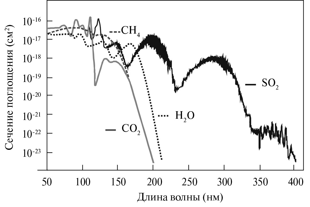 Рассматривая полученные результаты в контексте атмосферных фотохимических процессов в архее, можно сделать следующие предположения. Фотохимические преобразования SО2 в архейской атмосфере должны были быть в значительной степени экранированы от воздействия солнечной радиации в коротковолновом (184.9 нм) диапазоне, поскольку для архейских сульфидов установлен положительный наклон ∆33S/δ34S = 0.9, в то время как с излучением 184.9 нм ассоциируются отрицательный наклон ∆33S/ δ34S = −1.7 (рис. 2). Коротковолновая радиация могла быть поглощена газами СО2, СН4 и др., содержащихся в составе архейской атмосферы (рис. 3). С содержанием этих газов связывают и компенсацию низкой светимости Солнца для обеспечения температуры на поверхности Земли выше температуры замерзания воды (Галимов, 2017). Наличие воды в жидкой фазе является важным аспектом в предложенных моделях о функционировании механизмов по захоронению атмосферного аэрозоля серы в сульфидой и сульфатной формах в осадочных породах (Ono, 2017).