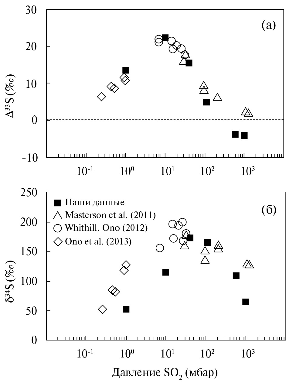 На рис. 4 продемонстрировано поведение ∆33S и δ34S в зависимости от давления SО2. При увеличении давления SО2 в диапазоне 1−1013 мбар характер изотопных трендов δ34S и ∆33S изменялся с возрастающего на убывающий. Наблюдаемое поведение δ34S и ∆33S в целом хорошо согласуется с данными из предыдущих экспериментальных работ (Masterson et al., 2011; Whithill, Ono, 2012; Ono et al., 2013), в которых были использованы Xe и/или D2 лампы в качестве источника света для инициирования фотохимических процессов в различных диапазонах давления SО2. Данные из этих работ приведены на рис. 4 (а, б) для сравнения с результатами наших экспериментов. Можно видеть, что в наших экспериментах магнитуда изотопной аномалии ∆33S и значения δ34S возрастали с увеличением давления SО2, достигая своего максимума при рSО2около 10 мбар и 40 мбар соответственно. Такое поведение ∆33S и δ34S вполне согласуется с данными (Ono et al., 2013; Whithill, Ono, 2012). Наблюдаемый в наших экспериментах тренд на понижение ∆33S и δ34S значений при дальнейшем повышении давления SО2 согласуется с данными (Masterson et al., 2011). Обнаруженное сходство в поведении изотопных эффектов может свидетельствовать о том, что фракционирование изотопов в фотохимических процессах под действием излучения Hg лампы (в области длин волн >190 нм) реализовывалось в основном по такому же пути, что и при действии излучения Xe и D2 ламп.