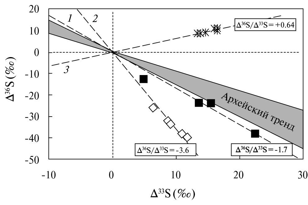 Рис. 5. Изотопные эффекты ∆36S относительно ∆33S в продукте фотохимической реакции S0 (элементарная сера), полученные в наших фотохимических экспериментах (квадраты), в сравнении с изотопными данными работ (Ono et al., 2013) (ромбы) и (Whithill, Ono, 2012) (звездочки). Штриховой линией обозначены изотопные тренды ∆36S–∆33S, построенные: 1 ― по нашим данным из табл. 2 при температуре ~30ºС (наклон ∆36S/∆33S = −1.7); 2 ― по данным работы (Ono et al., 2013) для экспериментов с полным спектром Xe лампы при pSO2 = 0.25−0.972 мбар и pN2 ≈0.25 бар (наклон ∆36S/∆33S = −3.6); 3 ― по данным работы (Whithill, Ono, 2012) для экспериментов с Xe лампой с фильтром, пропускающим излучение в спектральном диапазоне 250−330 нм при pSO2 = 6.4−34.2 мбар (наклон ∆36S/∆33S = 0.64). Для сравнения показан архейский тренд, который ограничен линиями с наклоном ∆36S/∆33S = −0.9 и −1.5.
