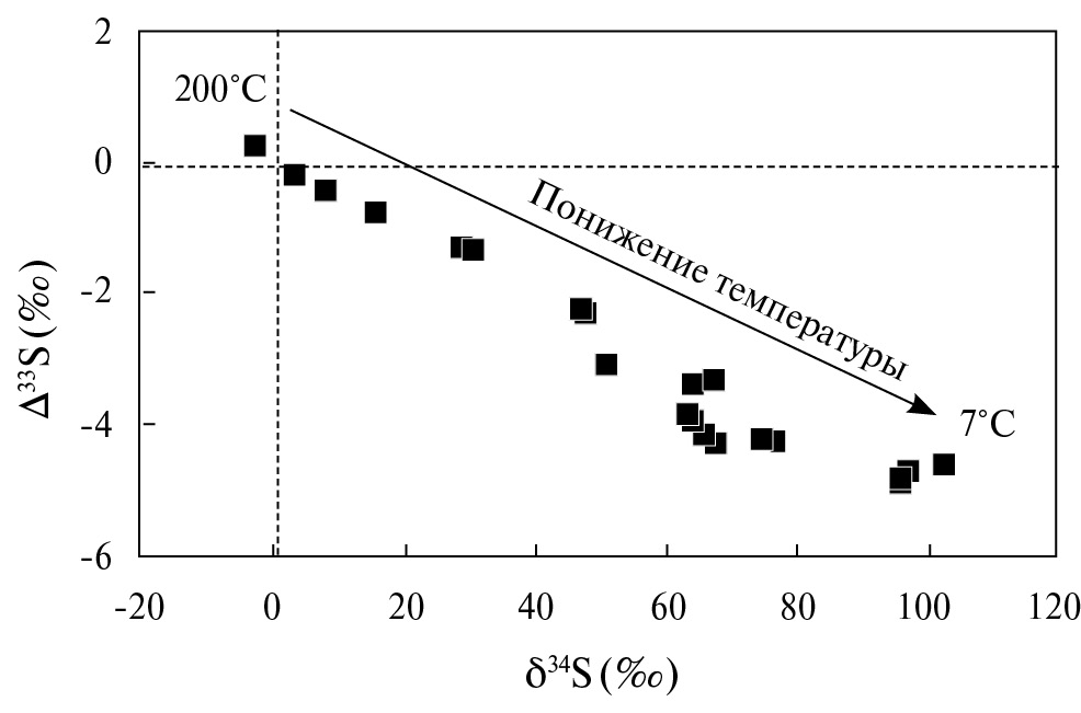 Рис. 7. График, демонстрирующий изменение значений δ34S и ∆33S в продукте фотохимической реакции S0 (элементарная сера) в зависимости от температуры (7−200ºC) в экспериментах по фотолизу SO2 под воздействием излучения Hg лампы в области длин волн >190 нм при постоянном давлении SO2 ~1013 мбар.
