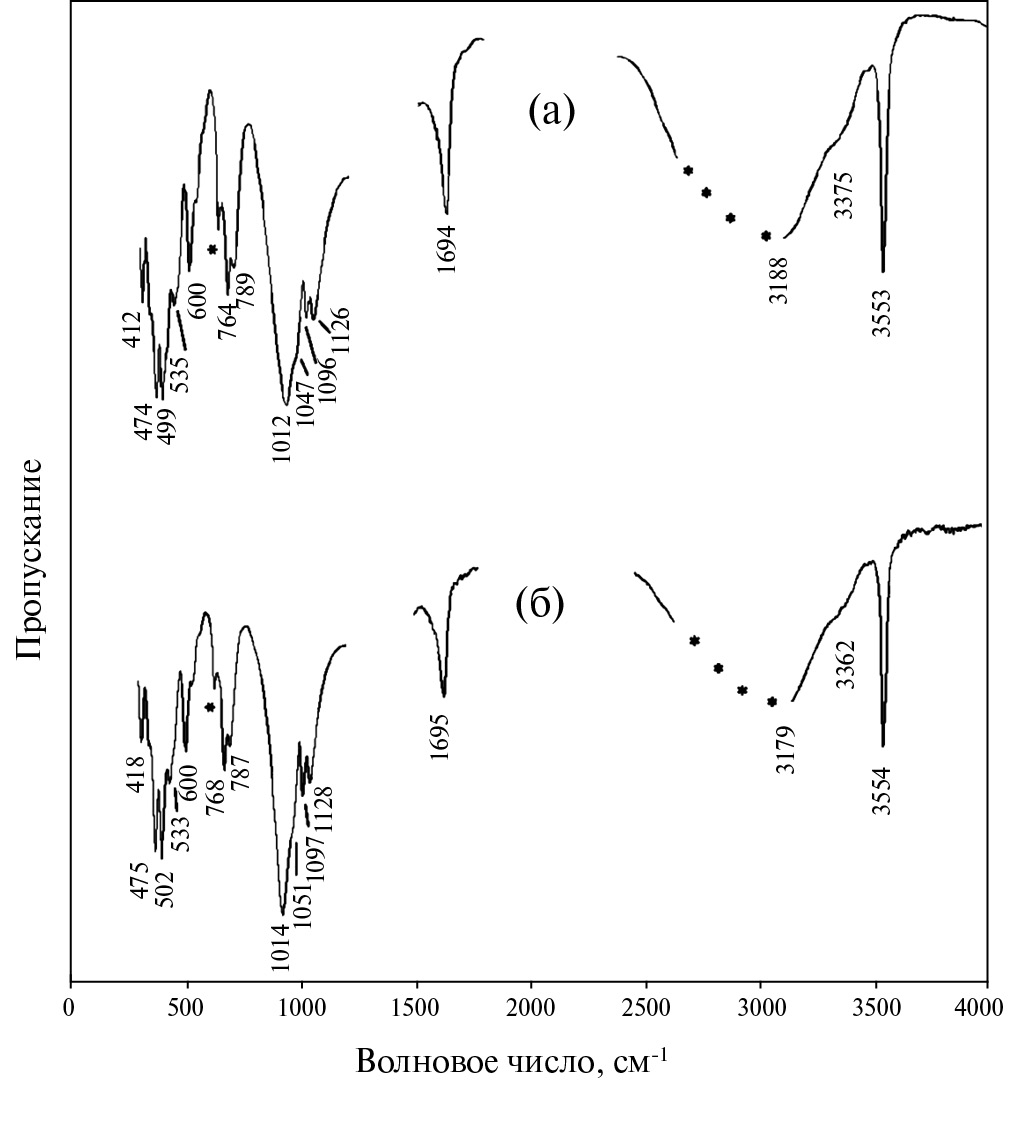 Рис. 1. Спектры ИК-поглощения апофиллитов (снято в режиме пропускания): (а) ― фторапофиллит-(K) (обр. I); (б) ― гидроксилапофиллит-(K) (обр. II), * ― области поглощения вазелинового масла.