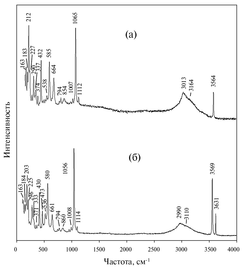 КР-спектроскопическое изучение (спектроскопия комбинационного рассеяния, КР, или Рамановская спектроскопия) выполнено на рамановском микроскопе EnSpectr R532 (Россия). Длина волны лазерного излучения составляла 532 нм, выходная мощность луча ― 30 мВт, голографическая дисперсионная решетка имела 1800 штр./мм, спектральное разрешение составляло 6 см−1, диаметр фокального пятна ― около 10 мкм при 40-кратном увеличении. Спектры сняты в интервале от 100 до 4000 см−1 на порошках апофиллитов в режиме накопления сигнала в течение 1 с и усреднения по 40 экспозициям. Спектры изученных образцов (рис. 2) имеют отличия, которые присутствуют как в области колебаний ниже 1200 см−1, так и в высокочастотной области, соответствующей валентным колебаниям ОН-групп. В области валентных колебаний кремнекислородных тетраэдров интенсивная линия рассеяния в спектре фторапофиллита (рис. 2а) с частотой 1065 см−1 сдвигается на позицию 1056 см−1 в спектре гидроксилапофиллита (рис. 2б). В области низких частот, связанной с трансляционными колебаниями катионов, линия с частотой 212 см−1 в спектре фторапофиллита также сдвигается в сторону более низких частот и регистрируется на позиции 203 см−1 в спектре гидроксилапофиллита. Еще одно отличие связано с присутствием линии рассеяния с частотой 473 см−1 в КР-спектре гидроксилапофиллита, что, вероятно, следует отнести к либрационным колебаниям гидроксильных групп, не ассоциированных в молекулы воды. Наибольшее различие в спектрах изученных образцов апофиллитов наблюдается в высокочастотной области. Комбинационное рассеяние на валентных колебаниях молекул воды в спектре фторапофиллита реализуется в виде двух линий ― узкой линии с максимумом около 3564 см−1 и широкой асимметричной линии с максимумом 3013 см−1 и крылом с частотой около 3164 см−1 (рис. 2а), что согласуется с (Ryskin, Stavitskaya, 1991). В спектре гидроксилапофиллита широкая асимметричная линия рассеяния претерпевает существенное уменьшение частот до 2990 и 3110 см−1 соответственно. Присутствующая в спектре гидроксилапофиллита еще одна высокочастотная компонента с максимумом на 3631 см−1 (рис. 2б) относится к валентным колебаниям, не ассоциированных в молекулы воды гидроксильных групп, и является отличительным диагностическим признаком, указывающим на присутствие в структуре минерала свободных ОН-групп. Полученные КР-спектры согласуются с результатами работ (Włodyka, Wrzalik, 2004; Goryainov et al., 2012).