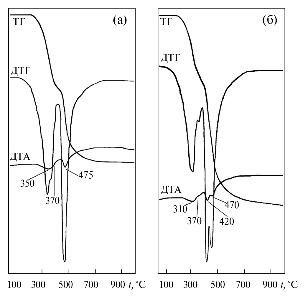 Рис. 3. Термограммы апофиллитов: (а) ― фторапо-филлит-(K) (обр. I); (б) ― гидроксилапофиллит-(K) (обр. II).