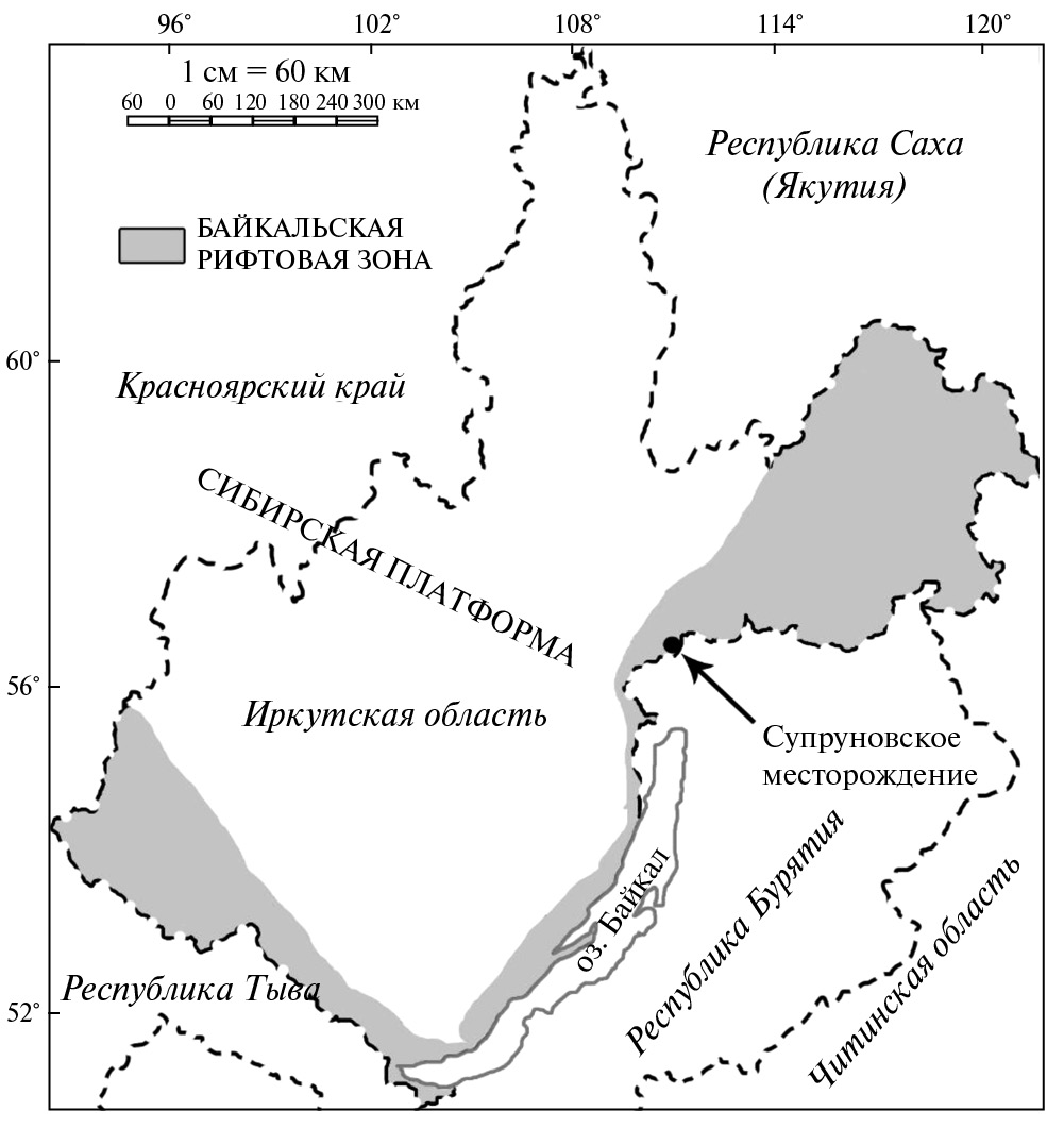 Рис. 1. Географическая схема расположения Супруновского месторождения в Иркутской области (юго-восточное обрамление Сибирской платформы).