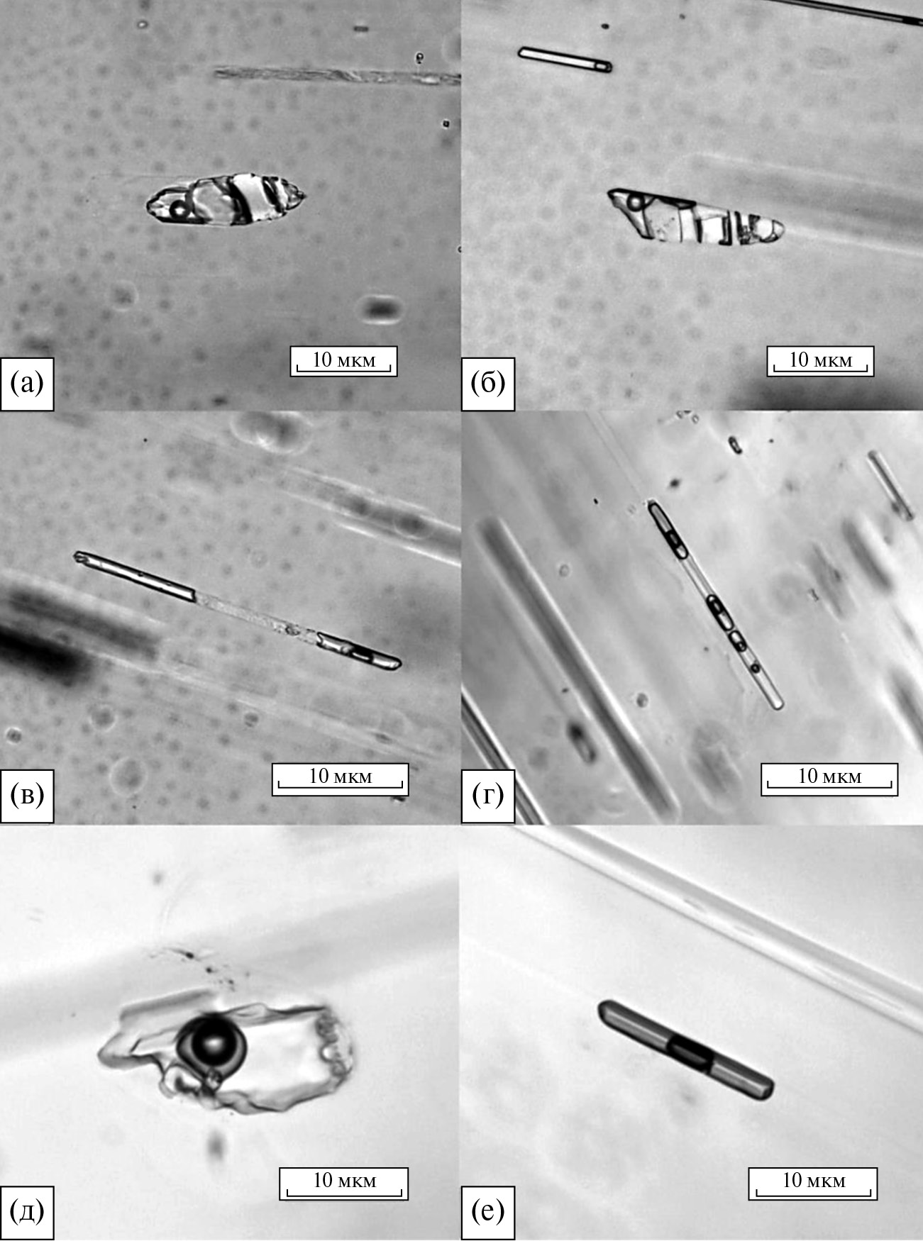 Рис. 3. Многофазовые (а)−(д) и двухфазовые (е) флюидные включения в аквамарине Супруновского месторождения. На (а)−(в) показан исходный вид многофазовых включений, (г), (д) ― вид включений после нагревания при 700°С в течение 3 ч и быстрой закалки. Масштаб 10 мкм.