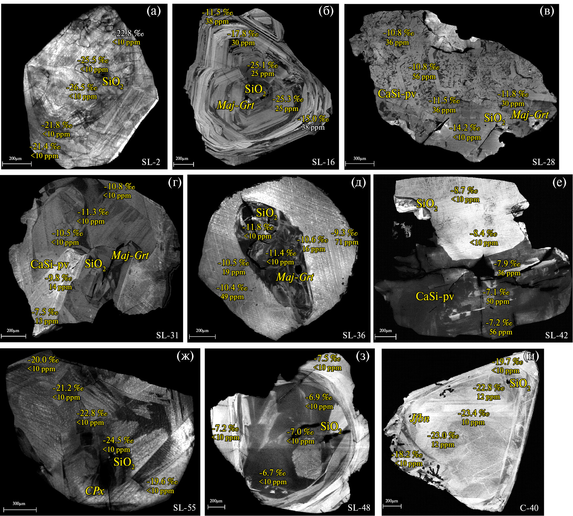 Рис. 1. Растровые изображения полированных поверхностей пластинок сверхглубинных алмазов с включениями SiO2 и других минералов из месторождения Джуина (Бразилия) в режиме катодолюминесценции: (а) ― SL-2; (б) ― SL-16; (в) ― SL-28; (г) ― SL-31; (д) ― SL-36; (е) ― SL-42; (ж) ― SL-55; (з) ― SL-48; (и) ― C-40. Показаны наблюдаемые ассоциации включений, вариации изотопного состава углерода (δ13С) и содержания азота.