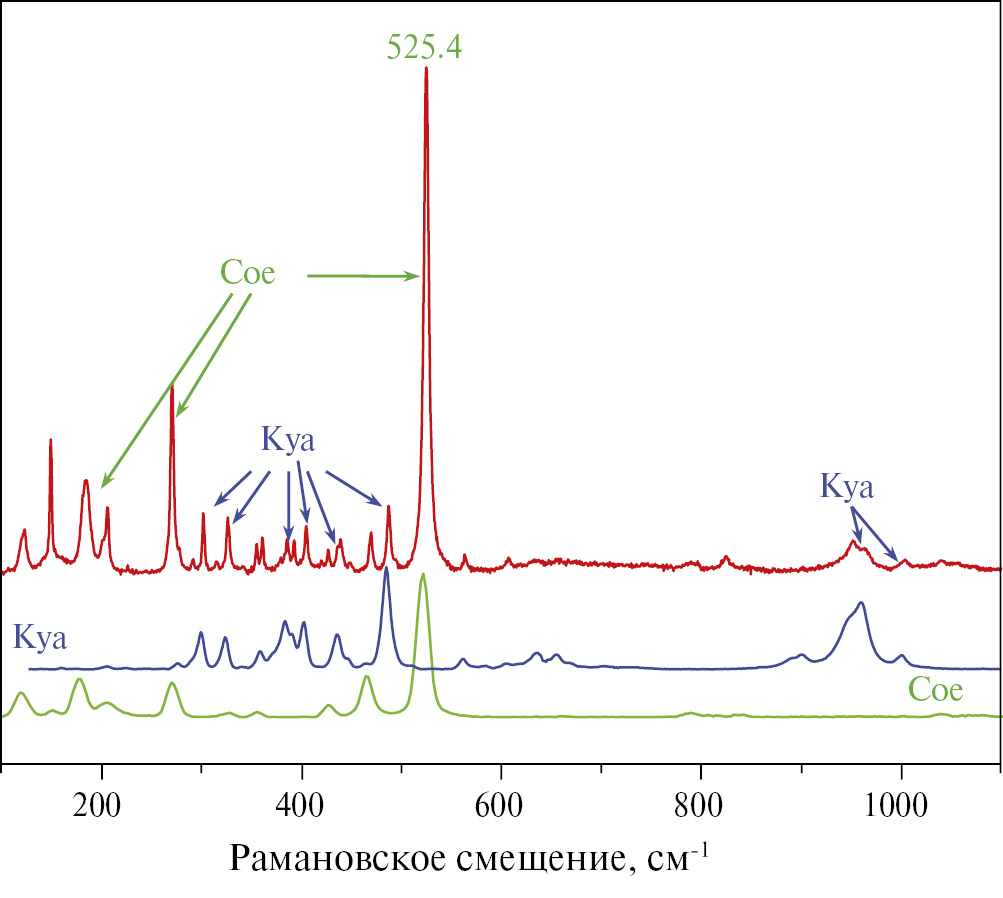 Рис. 3. Рамановский спектр in situ включения SiO2 в алмазе SL-55 в сравнении с эталонными спектрами коэсита и кианита из базы RRUFF.