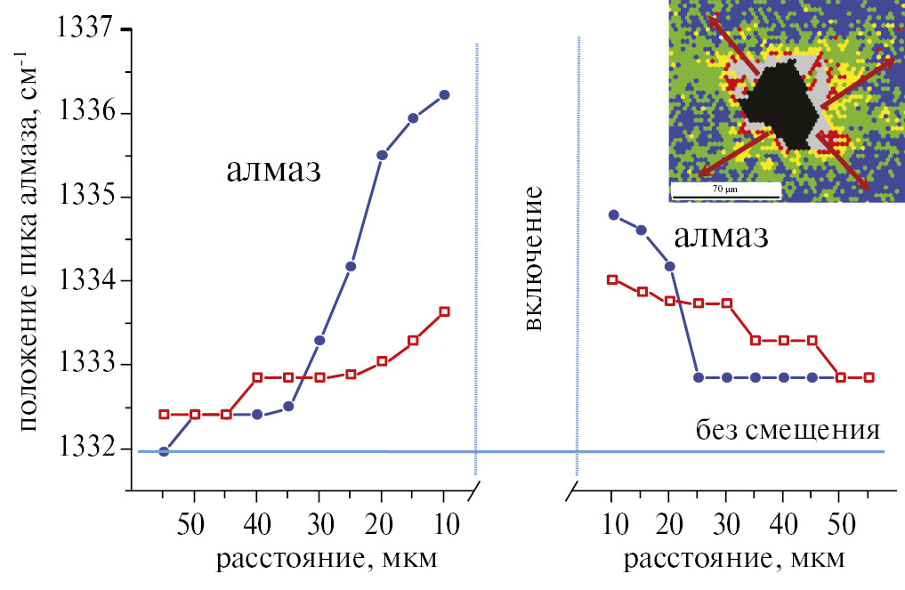 Присутствие свободной фазы SiO2 (коэсита или стишовита) в глубоко субдуцированных породах земной коры продемонстрировано многочисленными природными и экспериментальными данными. При этом были выявлены иcключительно шиpокие вариации cоcтава глубинныx коэcитcодеpжащиx парагенезисов в верхней мантии, а также изотопно-геохимические свидетельства их обpазования в pезультате cубдукции дpевней океаничеcкой коpы (Соболев, 2006). При возрастании давления (>9 ГПа) стабильной фазой SiO2 становится стишовит и минимальная глубина появления стишовита в мантии оценивается в 270 км (Zhang et al., 1993). Проведенные нами исследования не позволили выявить присутствие стишовита в изученных сверхглубинных алмазах. По данным Рамановской спектроскопии показано, что во всех случаях включения SiO2 представлены более низкобарической модификацией ― коэситом. Предполагается, что коэсит в сверхглубинных алмазах является продуктом ретроградного преобразования изначально захваченного стишовита, соответствующего области стабильности ассоциирующих с ним минералов (Kaminsky et al., 2012). Очевидно, что такие преобразования сопровождались большим объемным эффектом (~32%) и приводили к развитию внутренних напряжений в самих включениях и деформациям вокруг них.