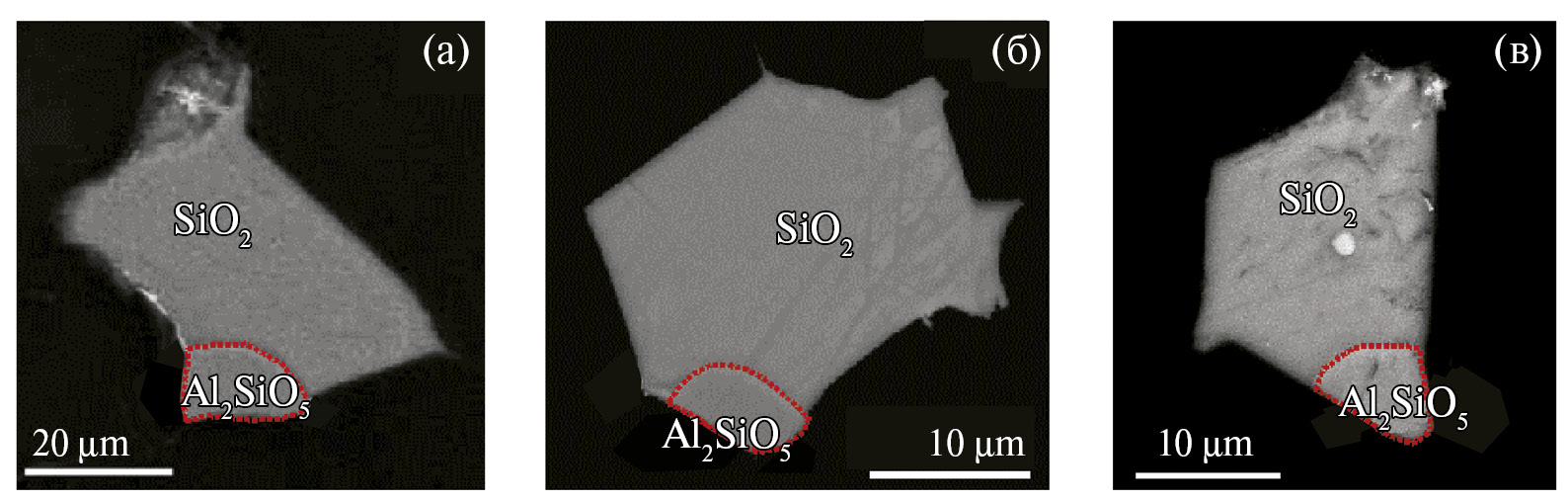 Рис. 5. Растровые изображения выведенных на поверхность включений SiO2 с микровыделениями Al2SiO5 в сверхглубинных алмазах в режиме обратно-рассеянных электронов: (а) ― SL-16; (б) ― SL-48; (в) ― SL-2. Состав фаз подтвержден по данным энергодисперсионной спектрометрии.