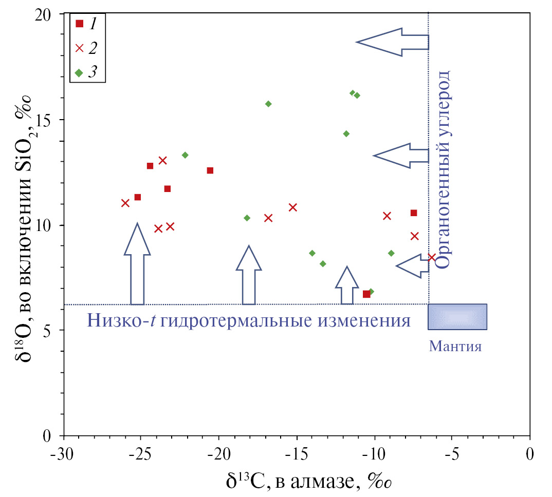 Характеристики изотопного состава кислорода включений силикатов (в т.ч. фаз SiO2) и изотопного состава углерода алмазов рассматриваются в качестве основных свидетельств их субдукционного происхождения (Schulze et al., 2013; Ickert et al., 2013). Полученные к настоящему времени данные указывают на широкие вариации изотопного состава кислорода включений SiO2 и изотопного состава углерода сверхглубинных алмазах. Предполагается, что значения δ18O, выше или ниже среднемантийных значений, отражают близповерхностные низко- или высокотемпературные гидротермальные изменения пород океанической коры (Тэйлор и др., 2005). При погружение таких пород на значительные глубины изотопный состав кислорода существенно не изменяется. Таким образом, высокие значения δ18O включений SiO2 в сверхглубинных алмазах определенно указывают на коровое происхождение субстратов, в которых кристаллизовались алмазы. Другим свидетельством корового происхождения сверхглубинных алмазов с включениями SiO2 является их облегченный изотопный состав углерода, который отражает изотопное фракционирование в результате биогенного или абиогенного цикла органического углерода на поверхности Земли (Kirkley et al., 1991; Shilobreeva et al., 2011). Отмеченная корреляция δ18O включений SiO2 и δ13C содержащих их сверхглубинных алмазов может быть связана с переуравновешиванием карбонатных расплавов субдукционного происхождения с восстановленными породами мантии на глубинах более 270 км (Burnham et al., 2015).
