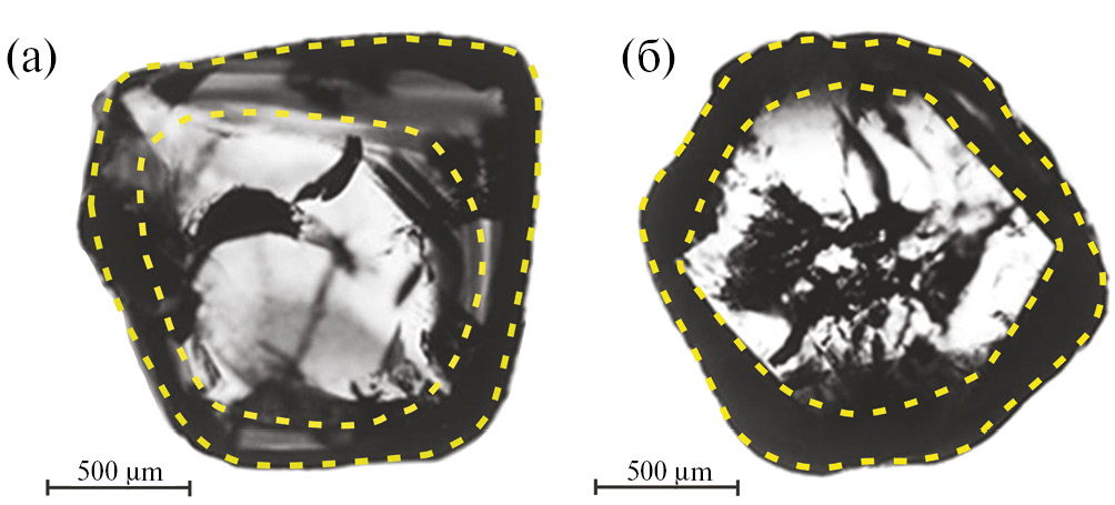 Для изучения были отобраны 10 алмазов, из них 5 алмазов кубического габитуса и 5 алмазов в «оболочке» (III и IV разновидности по классификации Ю.Л. Орлова (1984) соответственно), содержащих микровключения. Все выбранные алмазы имеют желто-зеленую или сероватую окраску. Для отобранных кристаллов характерна морфология, варьирующая от кубической формы до полукруглых индивидов тетрагексаэдрического или додекаэдрического габитуса. После полировки выявлены особенности внутреннего строения и распределения микровключений в изученных кристаллах. Некоторые алмазы III разновидности отображают концентрические зоны кубоида, определяемые различной плотностью включения (рис. 1а). Для алмазов в «оболочке» характерна внутренняя прозрачная область без микровключений и внешняя зона, насыщенная многочисленными микровключениями (рис. 1б).